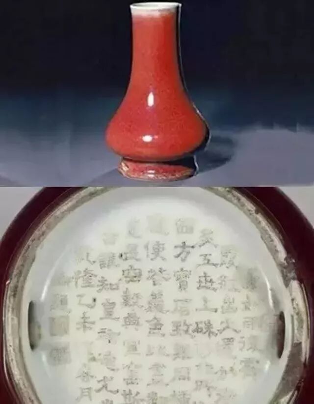 清康熙郎窑红釉穿带直口瓶,高20.8厘米,口径6.1厘米,足径9.1厘米。瓶直口,长颈,垂腹,圈足外撇。足外墙两侧各有一长方形穿孔,可穿系绳带。该器通体施红釉,因釉质在高温烧造时垂流而使口部显露出白色胎体,底部红釉凝聚,釉色浓重。外底施白釉并镌刻乾隆御制诗。