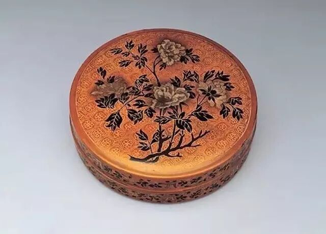明填漆牡丹圆盒,平顶直壁,平底浅凹。盖面及周壁以填漆为饰。盖面为朱地黄辉观牡丹花丛,花色以银粉漆为之,色粉微涣散;枝叶则黑漆黄理。周壁饰卷草纹间八梵字,梵字亦以银漆为之。