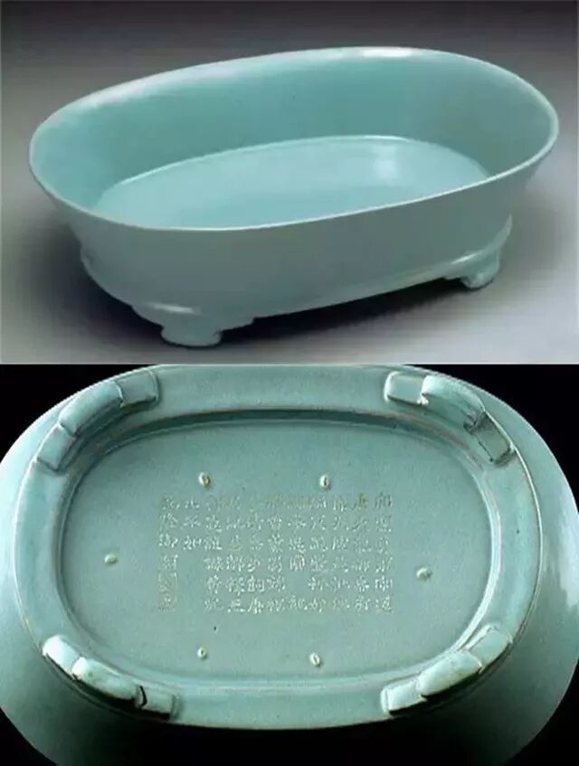 天青无纹椭圆水仙盆,高6.9厘米,横23厘米,纵16.4厘米,重670克,为椭圆形盆,侈口、深壁,平底凸出窄边稜,四云头形足;周壁胎薄,底足略厚。通体满布天青釉,极匀润;底边釉积处略呈淡碧色;口缘与稜角釉薄处呈浅粉色。裹足支烧,底部有六个细支钉痕,略见米黄胎色。此种汝窑瓷传世稀少,其温润素雅的色泽,正是宋人所欲追求的美感,据考证,此器为传世仅存的一件。