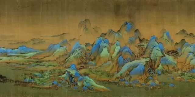 《千里江山图》纵51.5厘米,横1191.5厘米,绢本,青绿设色,无款,为宋代王希孟所作。作品以长卷形式,描绘了连绵的群山冈峦和浩淼的江河湖水,于山岭、坡岸、水际中布置、点缀亭台楼阁、茅居村舍,水磨长桥及捕鱼、驶船、行旅、飞鸟等,描绘精细,意态生动。作品意境雄浑壮阔,气势恢宏,充分表现了自然山水的秀丽壮美。