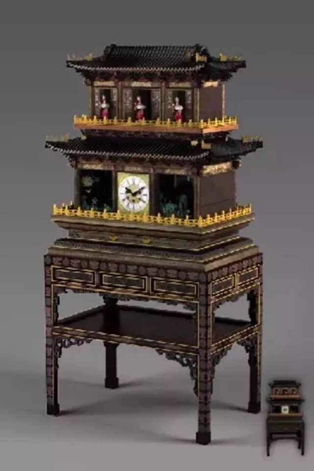 1、北京故宫博物院:彩漆描金楼阁式自开门群仙祝寿御制钟