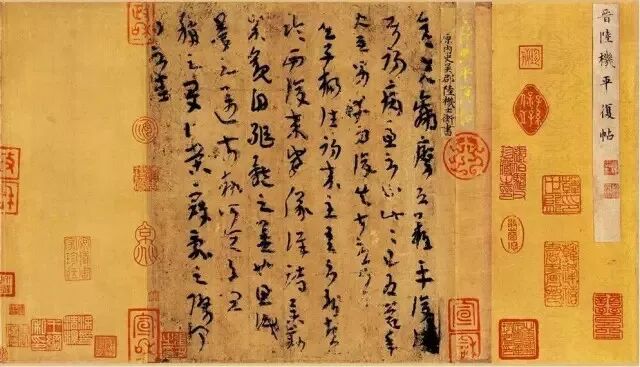 《平复帖》为牙色麻纸本墨迹,共9行84字,书写于西晋,宋人定为陆机作品,此帖笔意婉转,风格平淡质朴,其字体为草隶书。《平复帖》是传世年代最早的名家法帖,也是历史上第一件流传有序的法帖墨迹,有“法帖之祖”的美誉。