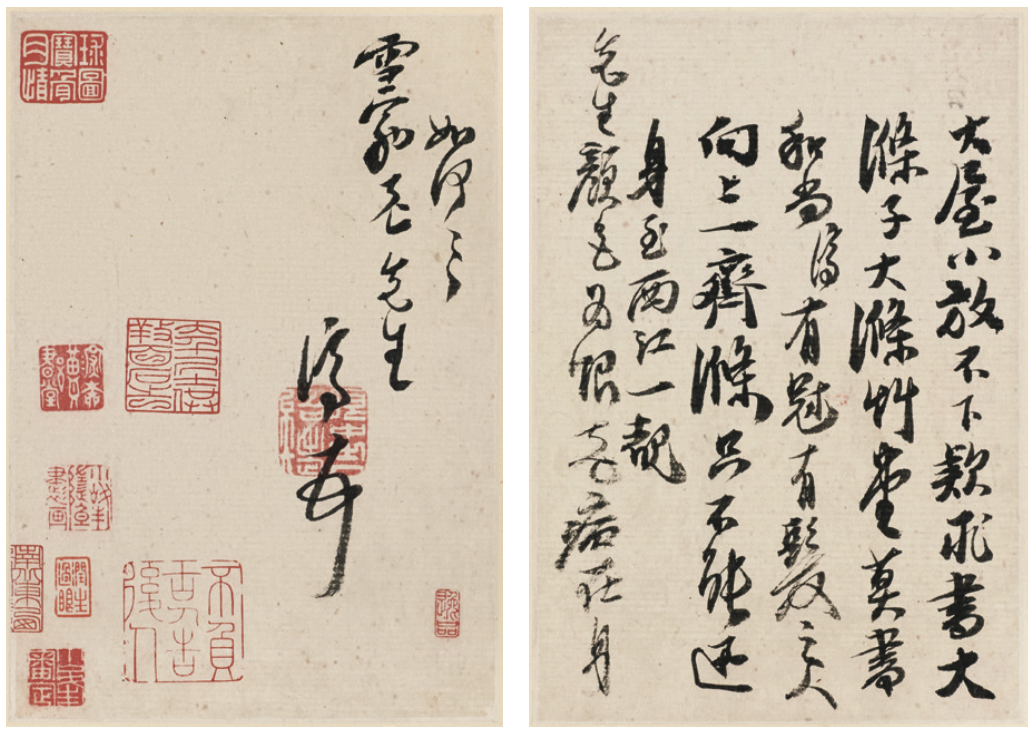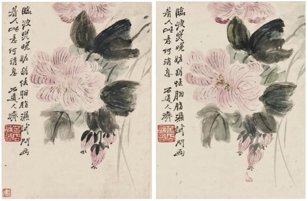 一个极佳的案例是石涛的《致八大山人函》。它是石涛的重要书法之一,是石涛与八大山人往来的珍贵历史资料,但因为张大千一个技艺精湛的“玩笑”,将它搅入了一段艺术史的纷争。石涛的真实面貌也因此变得含混不清。傅申对此案例的研究,从整体对比到细节分析,从笔迹研究到内容辨别,成功鉴别两个版本的真伪,也将对石涛的研究重新调回正确的轨道。透过它我们看到,当真迹和伪作混杂,艺术家、收藏家、鉴赏家和作伪者的身份交织在一处时,作者是如何透过层层迷雾,用他“侦探”般的眼光发现真相。另一个有趣的例子告诉我们,研究仿作亦是一种学习。赛克勒藏品中有两册几乎一样的《花卉人物》册页,一件是石涛亲笔,另一件则是摹本。