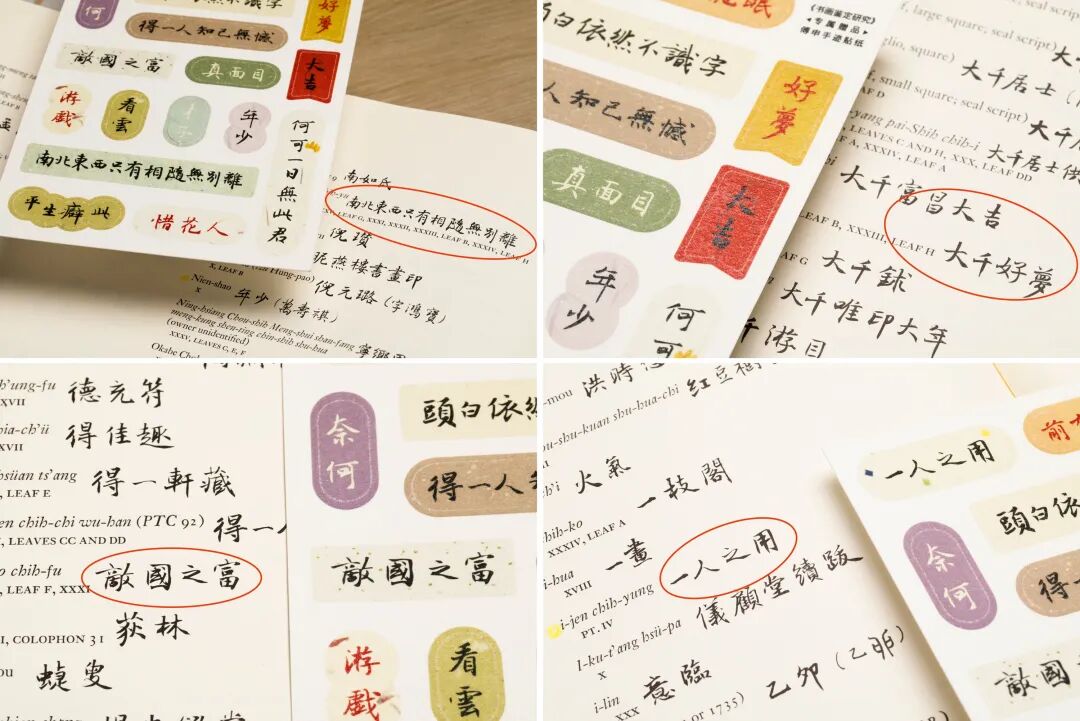 在《书画鉴定研究》的英文原版中,为了方便英语读者阅读,傅申用毛笔亲自抄录了中英文对照索引的中文部分。作为傅申早年手迹,这些文字极具纪念意义和收藏价值。在前期的读者调查中,保留傅申手迹的呼声很高。但由于中译后这些内容不再需要,删去很是可惜,所以我们特别选取其中部分带有吉祥寓意且有趣的文字,做成傅申手书吉语贴纸。