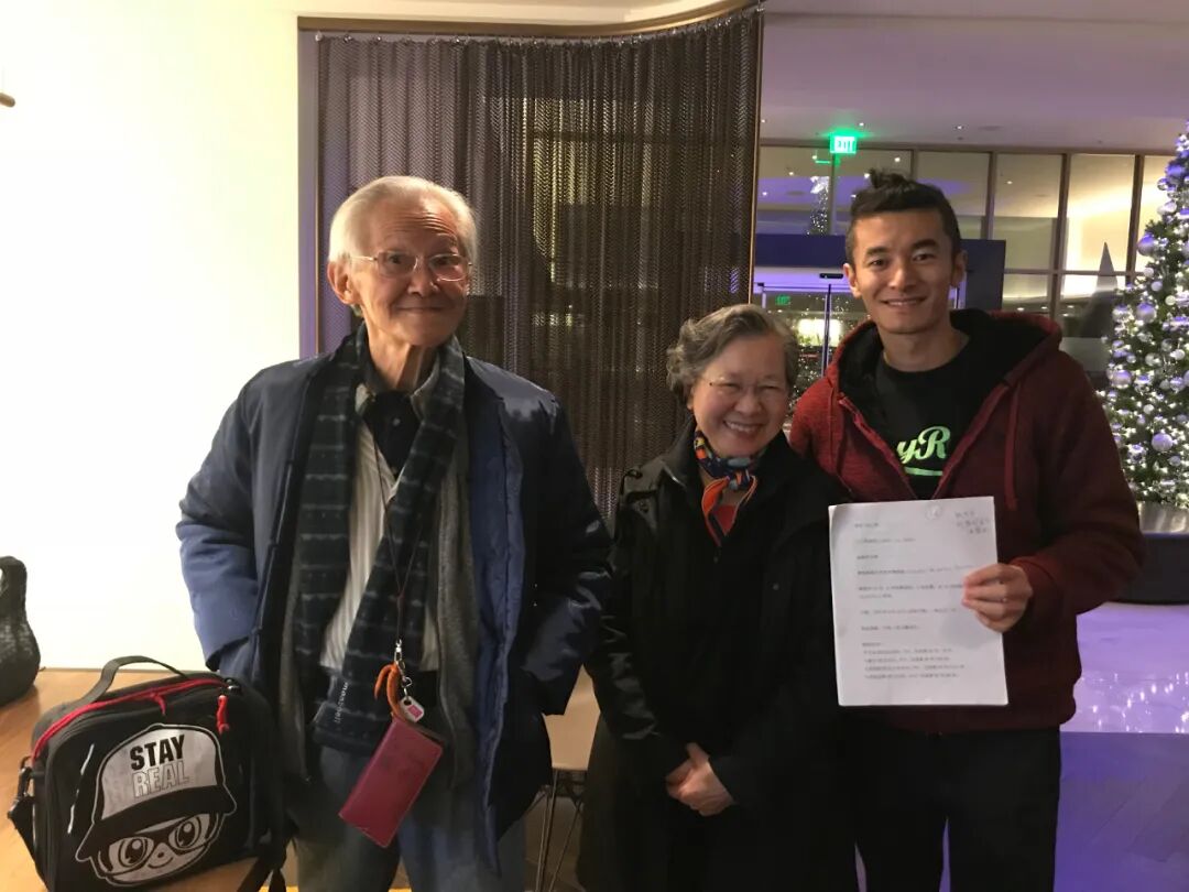译稿截稿留念,傅申(左),王妙莲(中),赵硕(右)。供图:赵硕