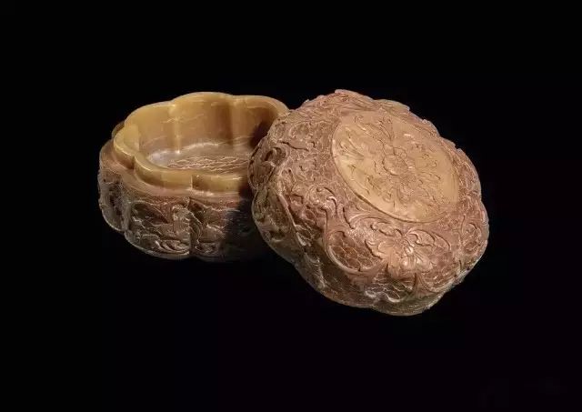 清 寿山石刻海水波涛紋描金地牡丹香盒