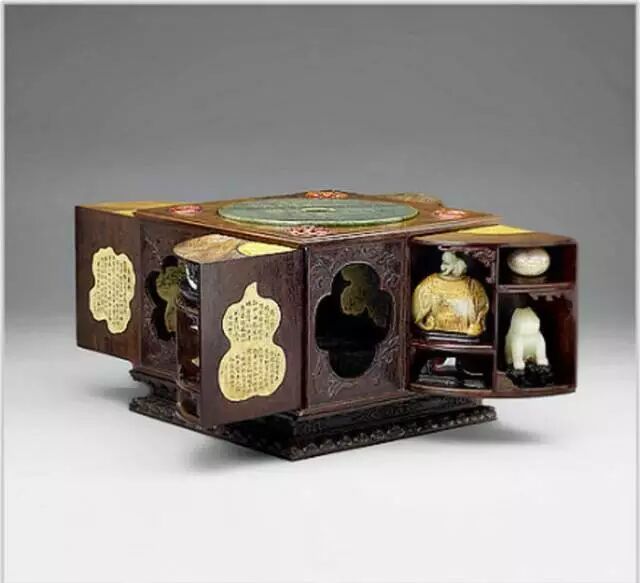 多宝格的设计,琳琅多样,精巧无比,不论盒、匣、箱、柜,皆是一种妥善利用空间的工艺作品、以最有限的空间,存放最多的物品,在造型上,力求美观精巧,所以往往一件多宝格,箱盖中有盒、盒中有套匣、套匣中又有屉、隐隐约约、辗转曲折,有时一个转纽,便见门,门之后,另有一番天地。