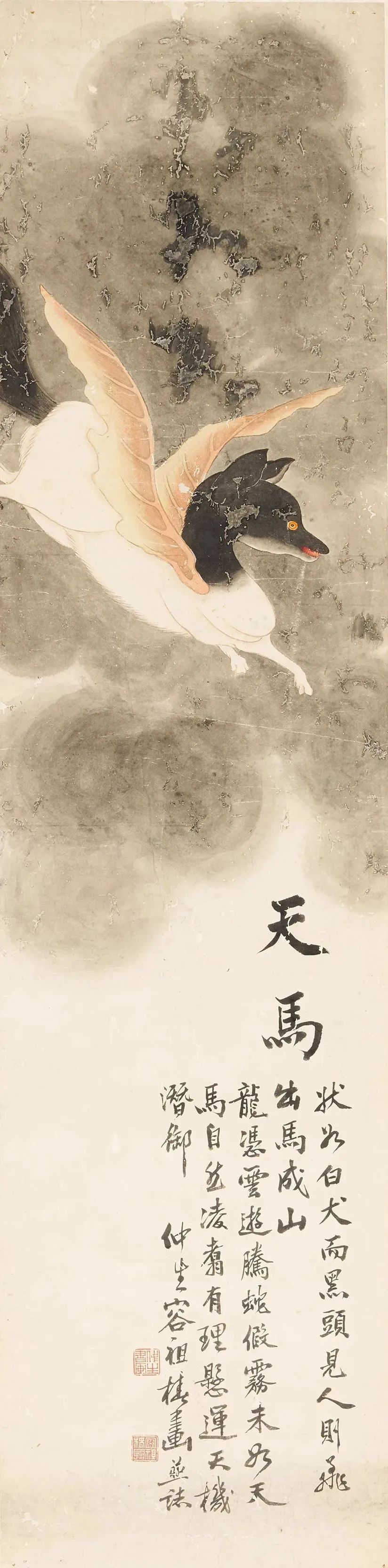 天马是祥瑞之兽,其形状却像狗,白身黑首,背后有肉翅能飞,每当天马出现时,天下便会迎来丰年。