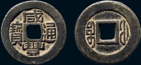 咸丰二年,清政府将咸丰通宝由一钱二分减重为一钱,后又减重为八分。后,直接铸造当十、当五十的大钱,重量分别为六钱、一两八钱。
