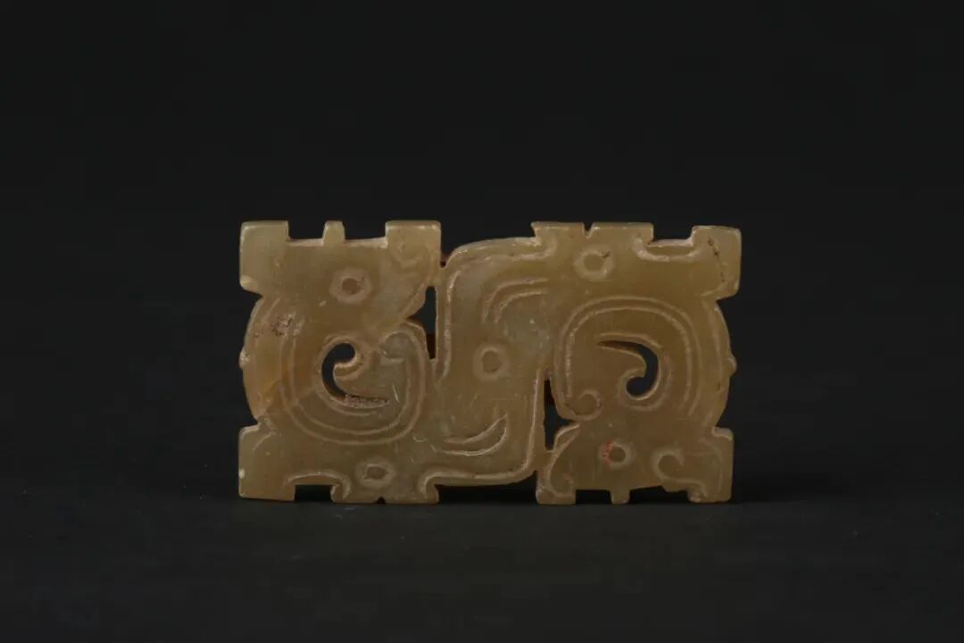 玉质青色,半透明状。此器呈扁平长方形,正面镂雕曲体双首共身龙,背面光素无纹。两龙首斜向对称,龙角顶部有突脊,形如冠状。器身雕刻细阴线纹。其左右两侧与背部各有两个对穿孔,以供佩系。