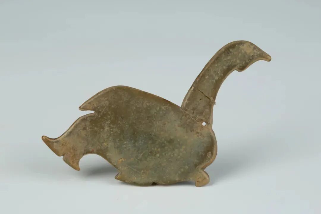 玉料呈青色,表面有黄白色沁痕。雁体扁平,雁作卧状,尾羽下垂,颈前伸,尖喙,颈根处有一圆孔,可供穿系之用,通体素面。