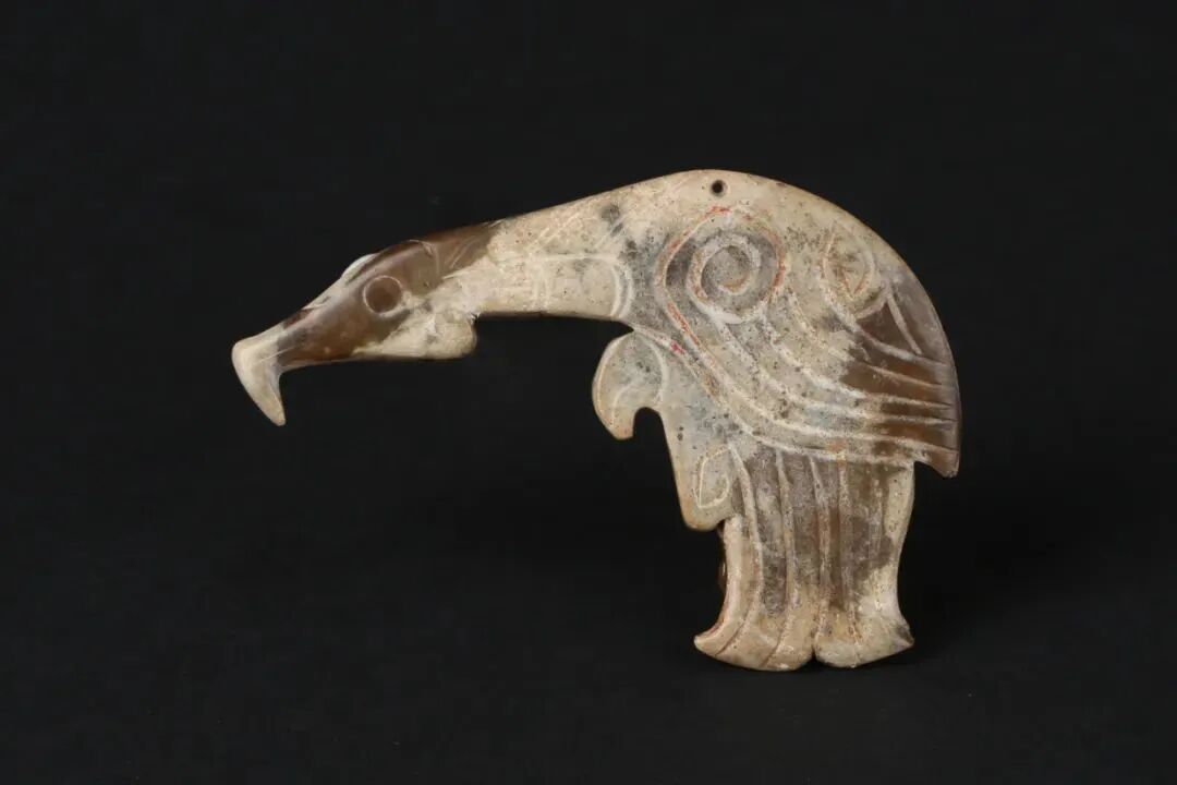 玉质为青色,因轻度浸蚀,呈现鸡骨白色。玉鹰体扁平,两面纹饰相同,皆以阴线琢成,长颈前伸,圆目钩喙,曲背垂翅,羽尾下收,作停立状。鹰身、翅、尾翎皆以阴线刻出。曲背及颌处各有一圆孔可供穿系佩饰。