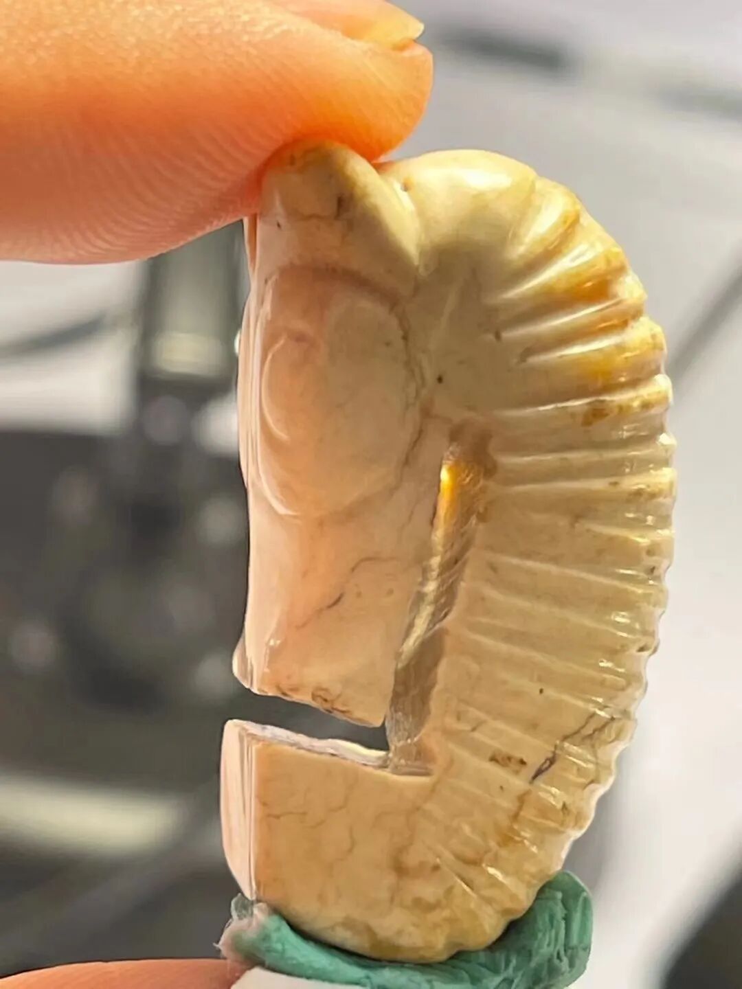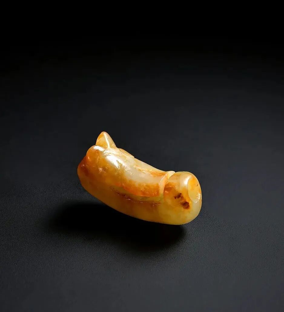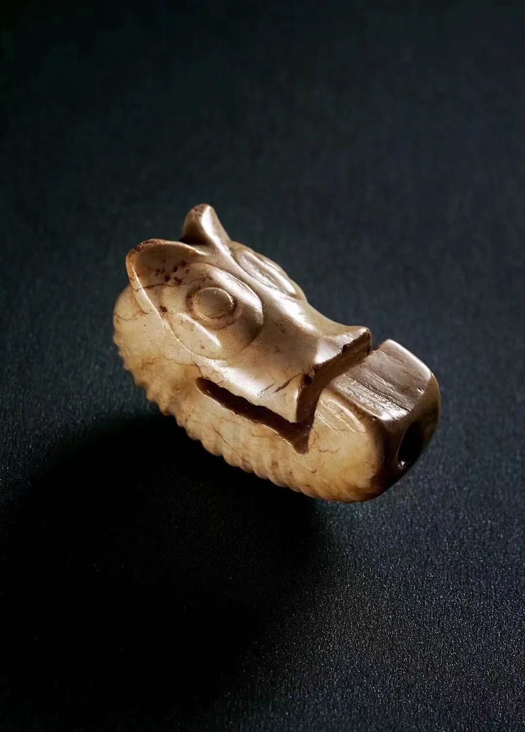 整体造型浑圆饱满,圆形大眼微突,双耳直立高耸,鼻吻横阔而前撅,口若獠牙,身体蜷曲,背后装饰平行凸棱纹,线条劲挺有力,顶部至底部双向贯穿打孔。其立体圆雕最为关键的加工,即为从龙口切入作L字形的线切割,玉工的沙绳犹如笔锋书写丹青,一气呵成,分割出龙嘴、龙首和龙身。