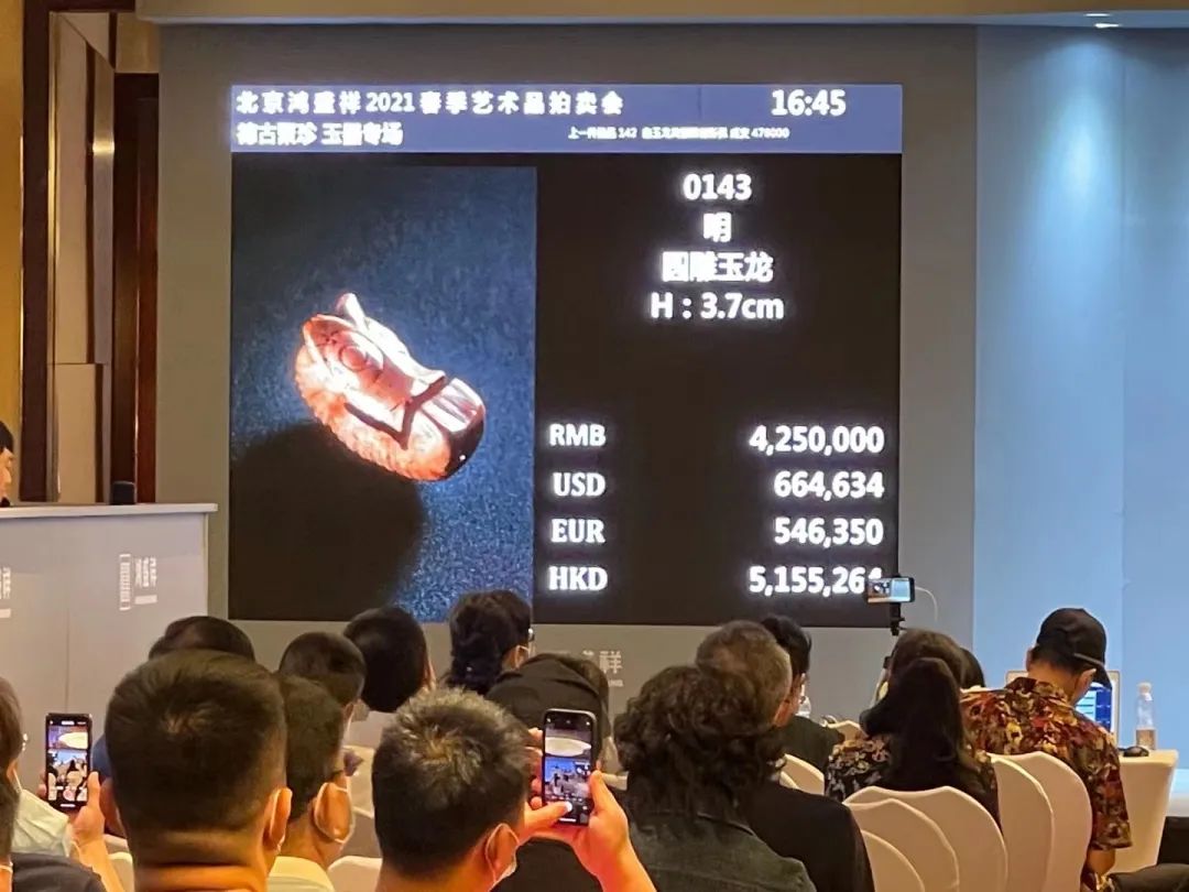 就如去年我们所说,488万拍出的玉猪龙这一圆雕立体龙首形玉器的发现,为我们认识浮雕阴刻龙首纹的真实形态,提供了依据。此件玉龙与同类器型相较,加工工艺更为繁复严谨,用料亦更加考究,十分具备收藏价值。而此件拍品在此次北京鸿盛祥2021春季艺术品拍卖会以488万尘埃落定,又辗转至台湾览山楼也算是玉龙的最好归宿。