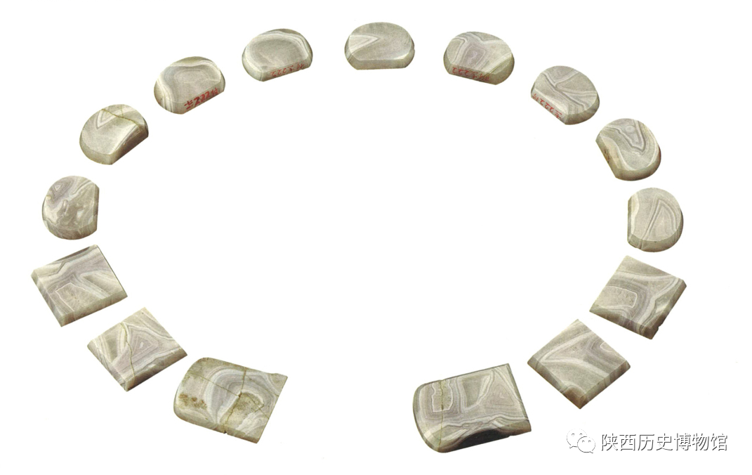 白玛瑙带饰:由方銙四、半圆形銙九、圆首矩形銙一、圆首矩形尾一组成,与银盒上墨书的“一十五事并玦”相符,材质细腻,呈淡红色与白色相杂的水波形状,纹路自然且富有变化,为上好的白玛瑙,加工精细,规整光滑。背面无钻象鼻孔。