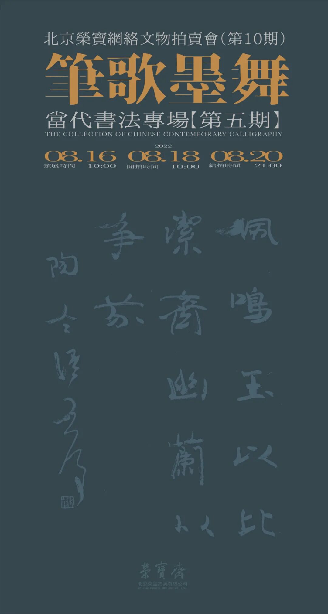 北京荣宝网络文物拍卖会(第10期)——笔歌墨舞·当代书法专场(第五期)将于8月16日10:00-8月18日10:00开启线上预展,并于8月18日10:00开拍,8月20日21:00结拍。