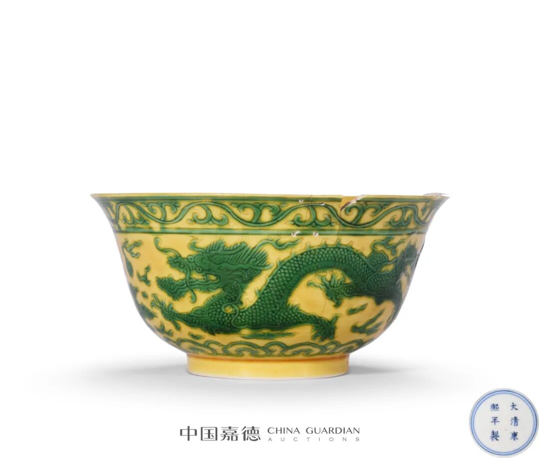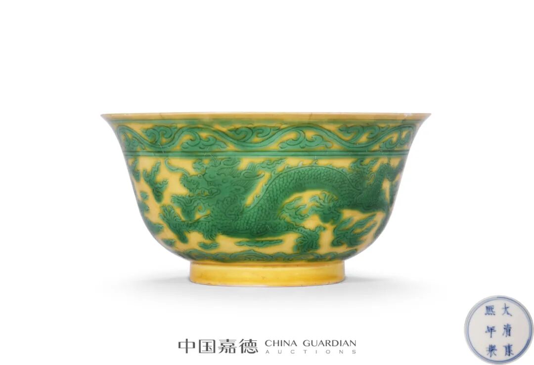 黄地绿彩最早出现于明永宣时期,其工艺较为复杂,当先于素胎之上锥刻纹饰以高温烧成涩胎,复施黄釉绿彩,再低温烘烧而成。明清时期,黄色为皇家专属,对于黄釉瓷器的管理十分严格,丝毫不得僭越。据《国朝宫史》载,这类黄地绿龙器为宫中贵妃所专享之物。因为需求量较少,所以生产数量便不及其它种类,清代康熙朝之遗存更属少见。