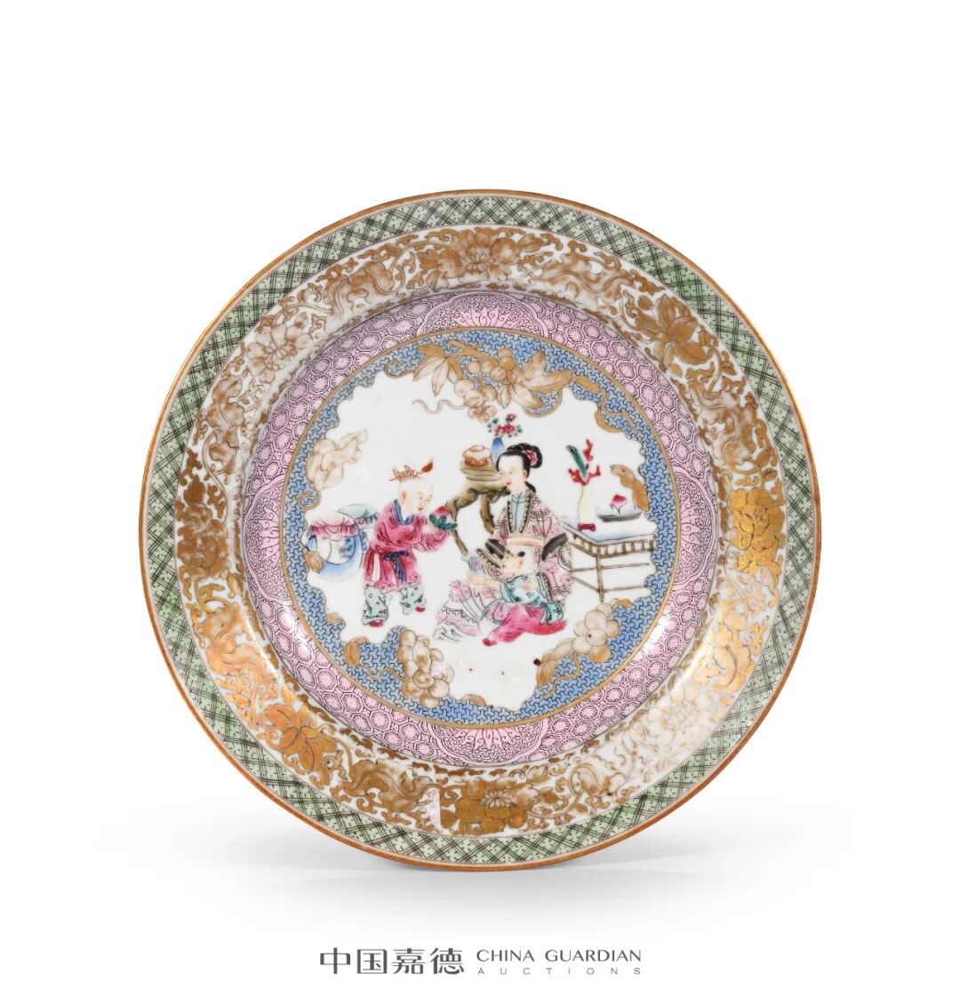 清雍正 内粉彩教子图外胭脂红釉折沿盘