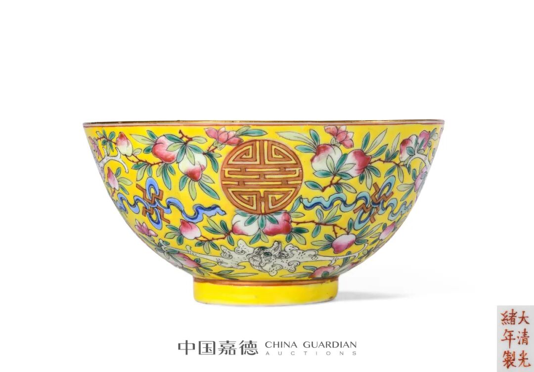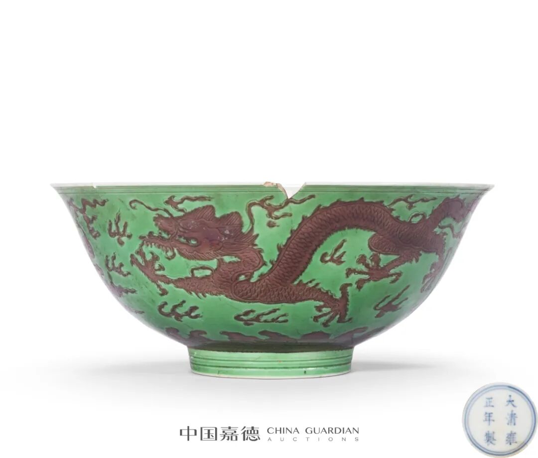 绿地紫彩为永乐御窑所创的低温釉,有明一代,仅见嘉靖一朝曾有续烧,其工艺颇为复杂。至清代,绿釉褐彩龙纹装饰成为官窑中常见的装饰,除了碗,还有盘,有的为内外满彩饰,有的内白外彩饰,为官窑传统品种。此碗样式为清代后宫的岁例用瓷,据清乾隆《国朝宫史》记载,其专供贵人一级使用。![]()
