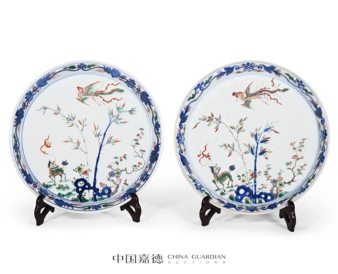 清康熙青花五彩麟凤呈祥折腰大盘一对