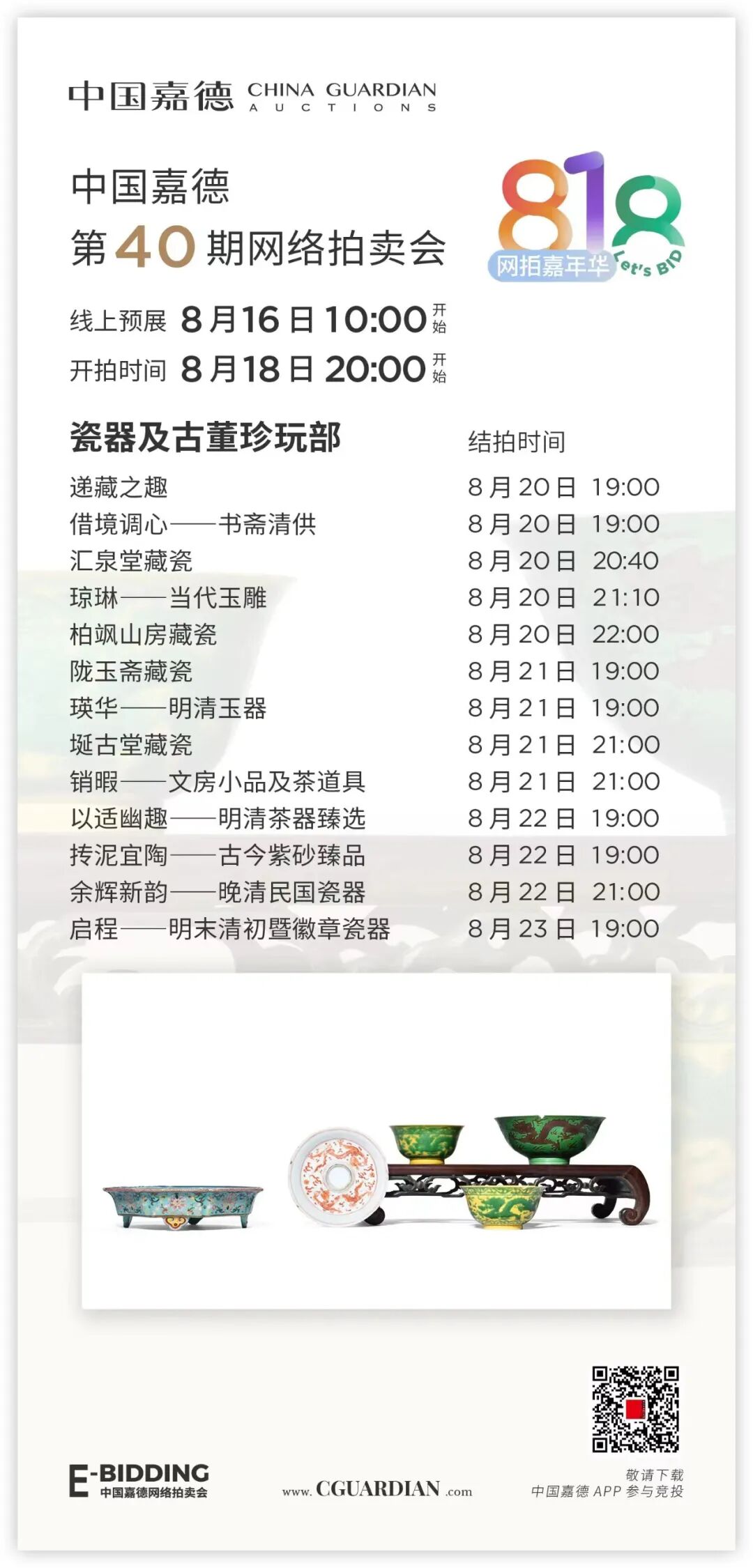●请您于参与拍卖活动当日24小时前完成账户注册并交纳保证金。●E-BIDDING提供预约鉴赏服务,敬请关注“中国嘉德网拍”服务号预约。鉴赏地点:嘉德艺术中心B1、B2层(北京市东城区王府井大街1号)。●中国嘉德为竞买人提供查看拍卖标的实物的条件,务请竞买人亲自审看。本公司对拍卖标的不承担瑕疵担保责任。请拨打1501000622015910807786![]()