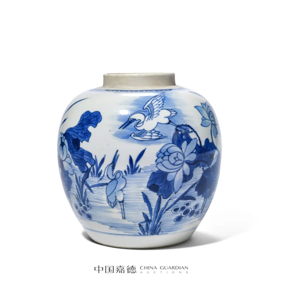 本品器型浑圆饱满,通体青花通景绘一路连科图。画面中水波粼粼,荷叶田田,见半空中一白鹭振翅翱翔,水面上见一白鹭昂首仰望,顾盼之间,骤生动感。在中国古代吉祥纹饰中,白鹭与青莲组合出现,常取其谐音,富于“一路连科”、“一路清廉”之寓意。本品构图严谨,青花渲染合乎法度,为典型康熙青花佳作。![]()
