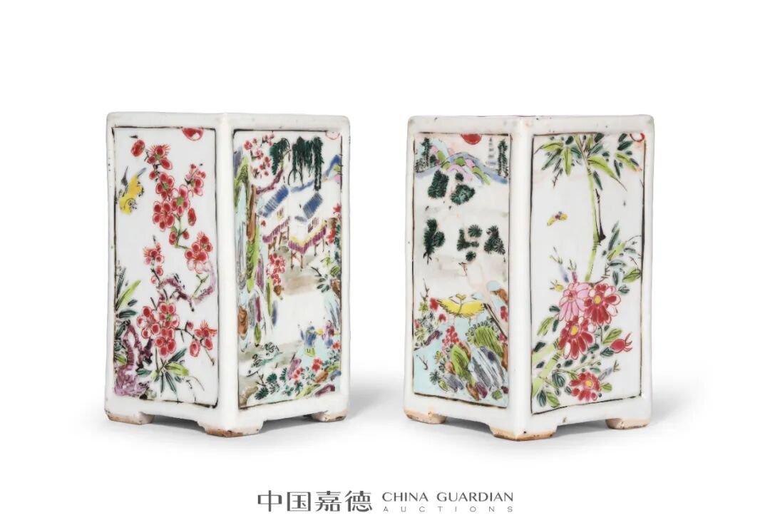 清雍正粉彩山水人物花鸟纹四方笔筒一对