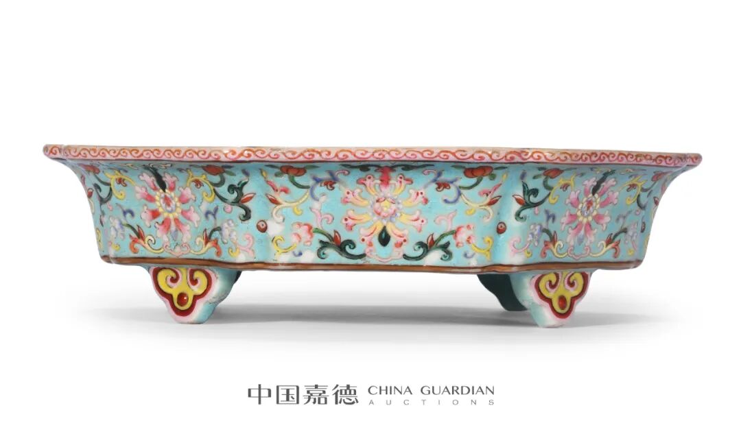 此花盆造型规整,呈五瓣式花口,下承五如意形足,口沿微微外撇,饱满圆润,便于多角度观赏。内壁满施松石绿釉,外壁以松石绿地洋彩缠枝花卉纹为饰,纹饰立体饱满,明暗交错,为典型乾隆宫廷洋彩装饰风格。