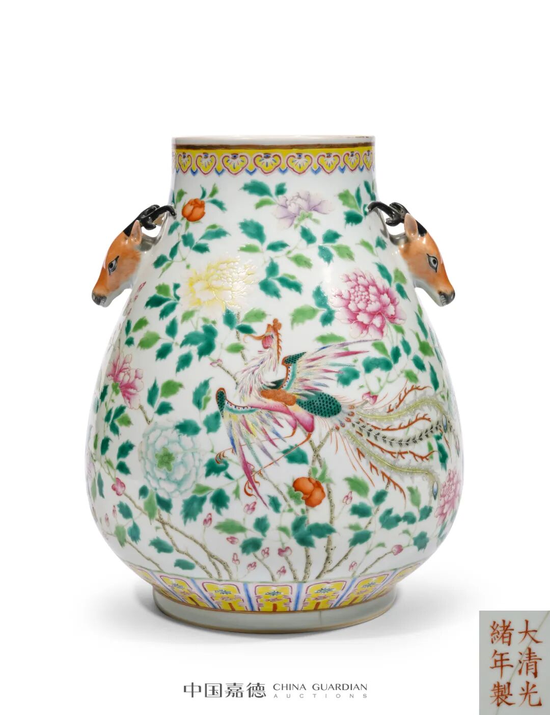 鹿头尊器形首创于康熙朝,雍正时期亦有烧制,因造型似鹿头或牛首而得名,故又名“牛头尊”。此一造型,有清一代,一直延续。本品通体以粉彩绘制凤穿牡丹纹,纹饰描绘细腻,设色丰富,凤纹姿态飘逸,极为灵动。其器型端庄挺拔,不失为一件清代晚期粉彩佳作。