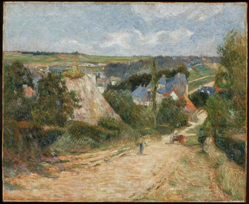 从19世纪70年代中期开始,当他还是一个 "周日画家 "(非职业画家或未经专业培训的画家)时,高更花了很多时间与印象派画家在一起,与他们一起展览并收集他们的画作。这幅乡村风景画的生动色彩、细小笔触和不显眼的主题反映了毕沙罗的影响,高更于1882年和1883年在蓬图瓦兹和奥斯尼与他合作。高更将画笔定向分组并压缩空间中景的方式表明他熟悉塞尚的工作方法;这位普罗旺斯艺术家也曾在蓬图瓦兹同高更和毕沙罗一起作画。