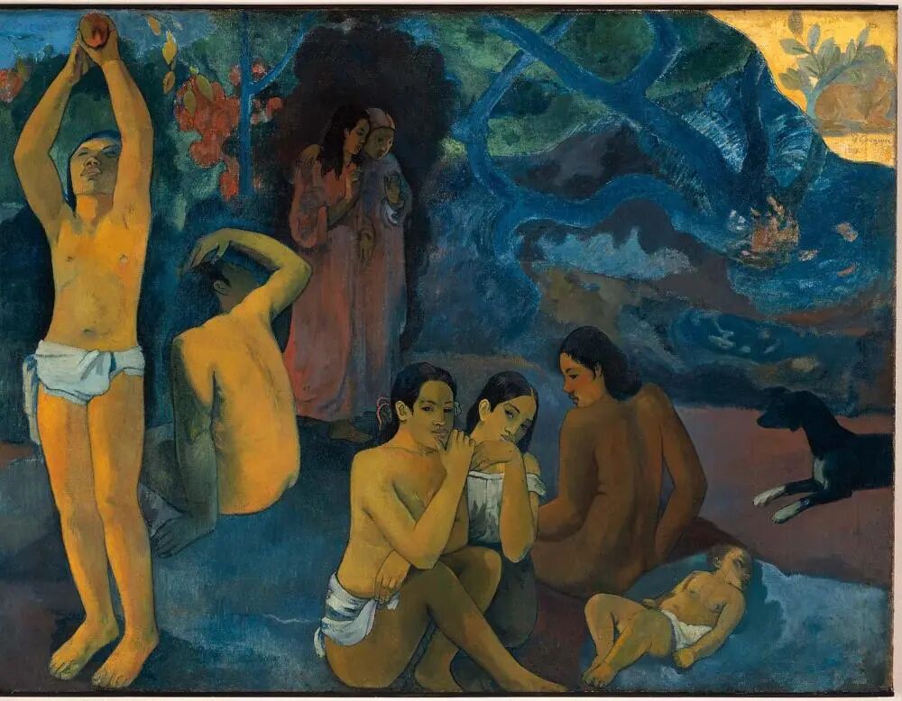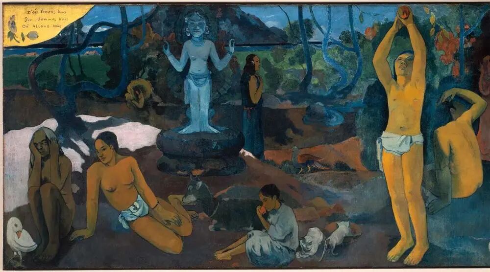 1897年的冬天,高更经历了一场心理危机。他在六年前离开法国前往塔希提岛,希望在这个当时的法国殖民地发现一个未受破坏的热带天堂,在那里他可以过上负担得起的生活,并促进他的艺术发展。然而现实与愿望相反,他对他所目睹到的现代性生活感到失望,他与法国殖民当局的对峙、纷扰,在经济上的困窘,并忍受着精神和身体状况的急剧恶化。在个人困境加剧的时候,高更在这幅不朽的画作中探讨了关于生命的本质和意义的基本问题——这是他创作生涯中最大的一次尝试——在装饰性壁画方面进行雄心勃勃的努力,这无疑显示了高更已经在考虑他的艺术遗产。