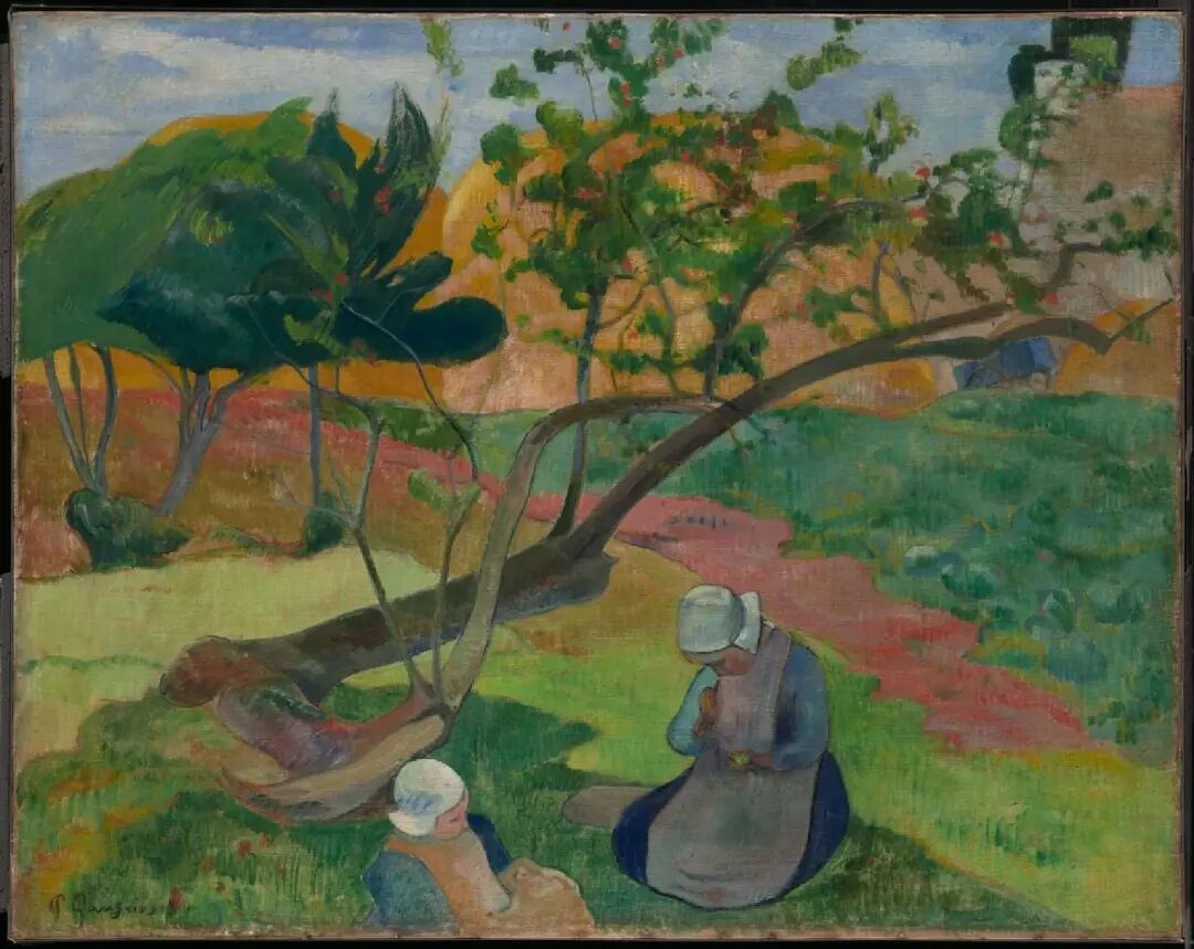 1886年至1891年间,高更在法国西北部布列塔尼的蓬塔旺的乡村度过了很长一段时间。尽管蓬塔旺是一个成熟的国际艺术家聚集之地,也是受欢迎的旅游目的地,但它独特的当地习俗和服装吸引了高更和其他人,因为它与城市和工业化的巴黎不同。在构建的日常生活场景中,比如在这幅画中,高更利用了布列塔尼地区遥远而古老的神话概念,以及其居民所拥有的深厚的宗教信仰,这使他的画作充满了精神领域的意味,即使这种感受仍是模糊的。在这幅画中,两个布列塔尼农民坐在明亮的风景中的一棵衰弱的树的树荫下。其中一个人起初似乎是在祈祷,但实际上她在吃东西——左手拿着一块水果,右手拿着一把刀。另一个人物被画布的边缘突然裁剪,让人想起日本版画中常见的构图方法,并被埃德加·德加所效仿。厚重的轮廓和平坦的色彩段落显示出高更继续偏离印象派的特点,并在艺术表达上不断简化。