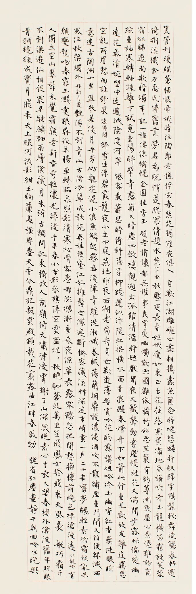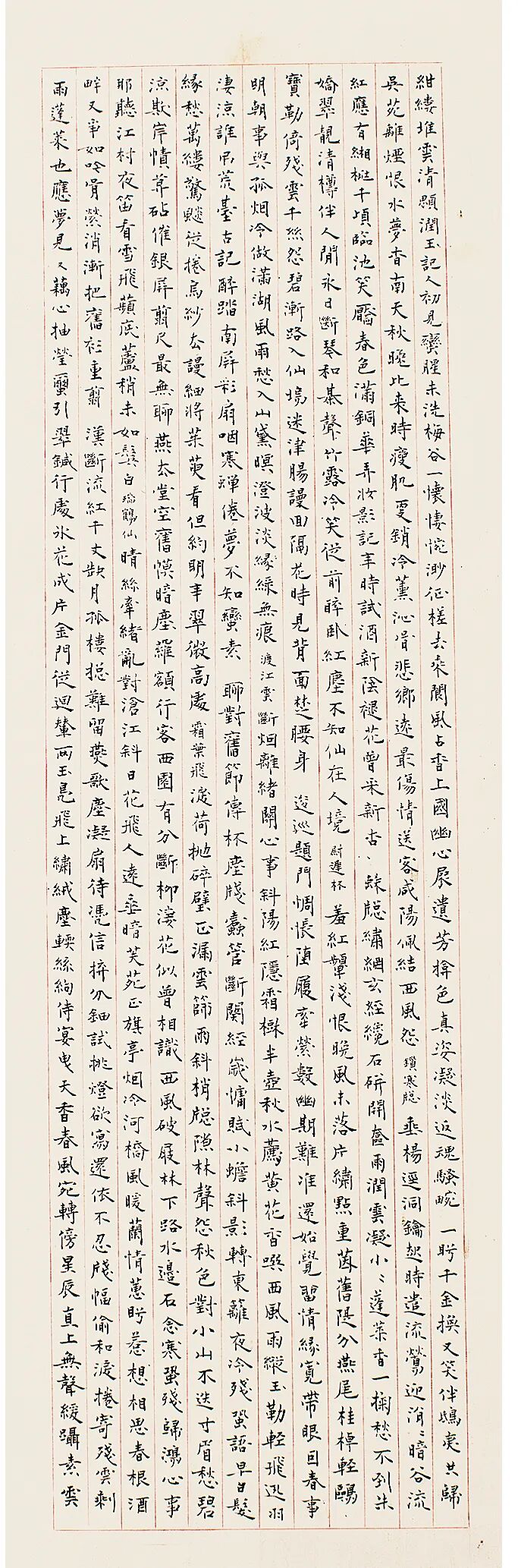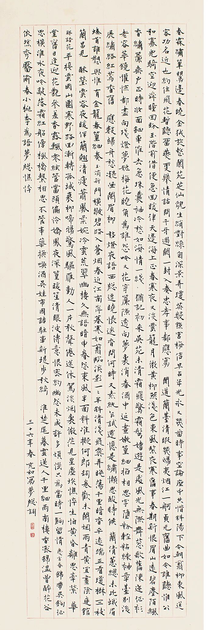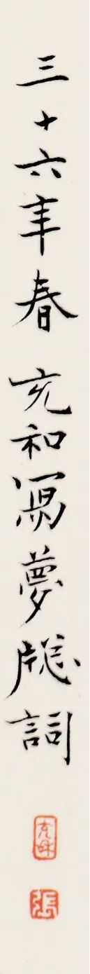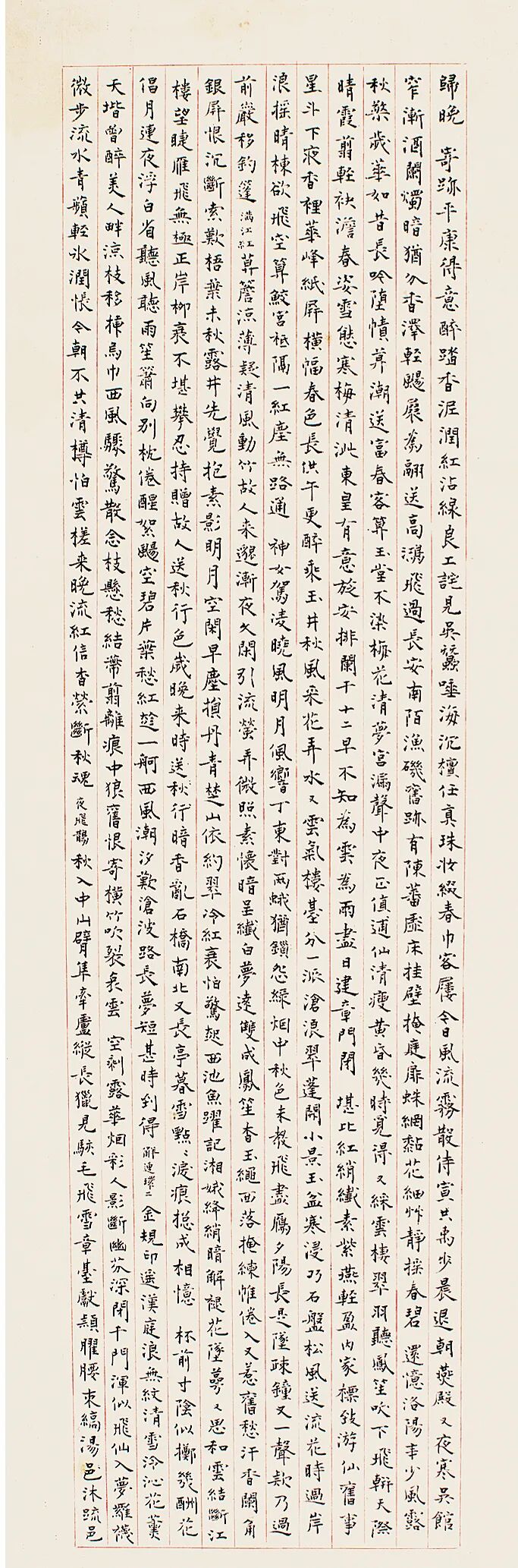 释文:归晚。寄跡。平康得意,醉踏香泥,润红沾线。吴蚕唾,海沈楦。任真珠装缀,春申客屦,今日风流雾散。待宣供、禹步宸游,退朝燕殿。夜寒吴馆窄。渐酒阑烛暗,犹分香泽。轻帆展为翮。送高鸿飞过,长安南陌。渔矶旧迹。有陈蕃、虚床挂壁。掩庭扉、蛛网粘花,细草静摇春碧。还忆。洛阳年少,风露秋檠,岁华如昔。长吟堕帻。暮潮送,富春客。算玉堂不染,梅花清梦,宫漏声中夜直。正逋仙、清瘦黄昏,几时觅得?……梦窗憔悴。