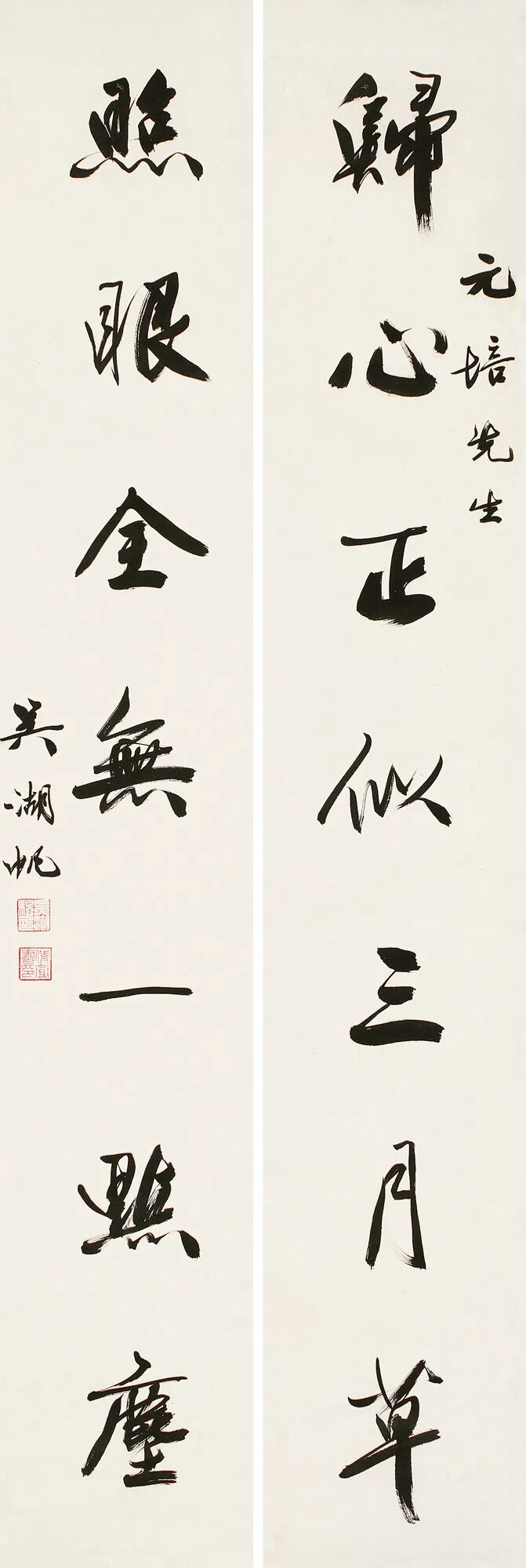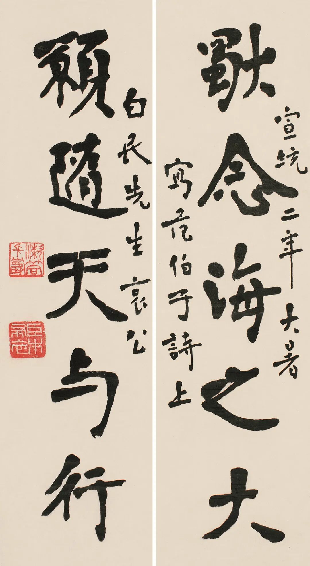 此幅楷书五言联是弘一法师在1910年时为好友杨白民所做,不仅书法雄浑有力,内容亦饱含深意。当代著名书画家范曾在文章中写道:“(弘一)1910年(宣统二年)学成归国,就是这一年他曾书写我曾祖范伯子的诗句‘独念海之大,愿随天与行’给杨白民;弘一所以对范伯子的诗敬慕,除去先曾祖诗的雄奇恣肆的魅力外,还由于他与先祖父范罕先生同时游学于日本,视为莫逆。”