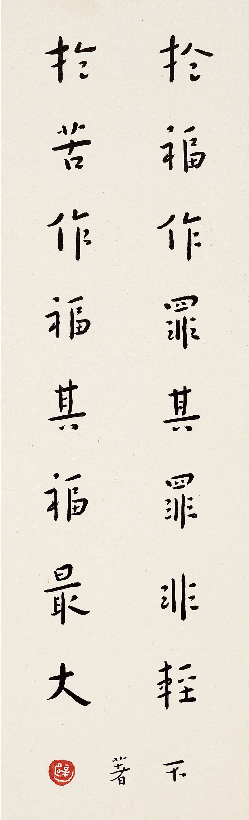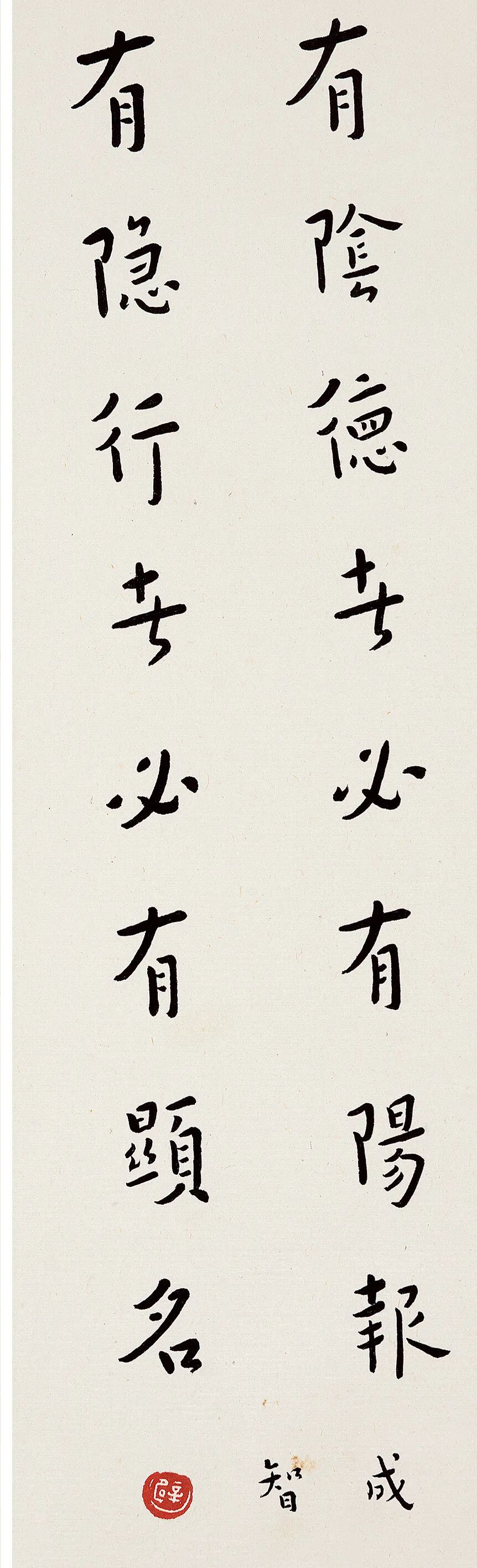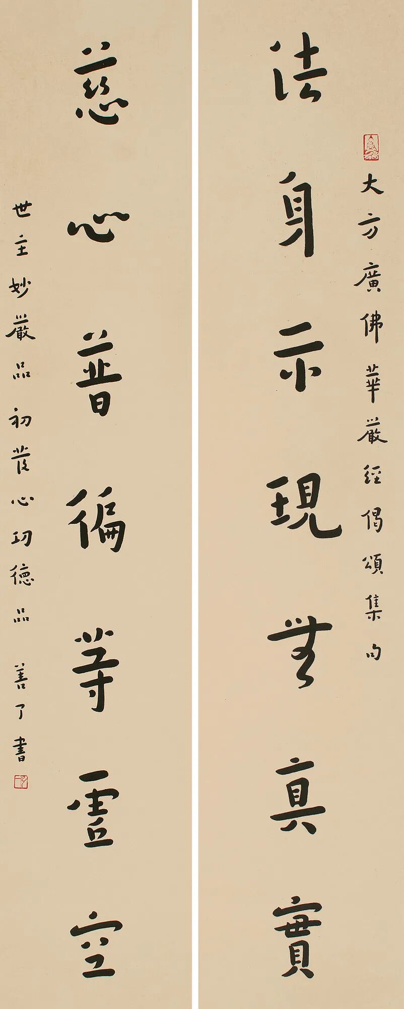 此幅对联为弘一法师中期书法的典型风貌,浩然正气一览无遗。“平划宽结,斜划紧结”,弘一书法早年取法《张猛龙碑》,笔意雄厚,气势开张,用墨滋润,结构精绝、奇正相生,一派北魏风骨。