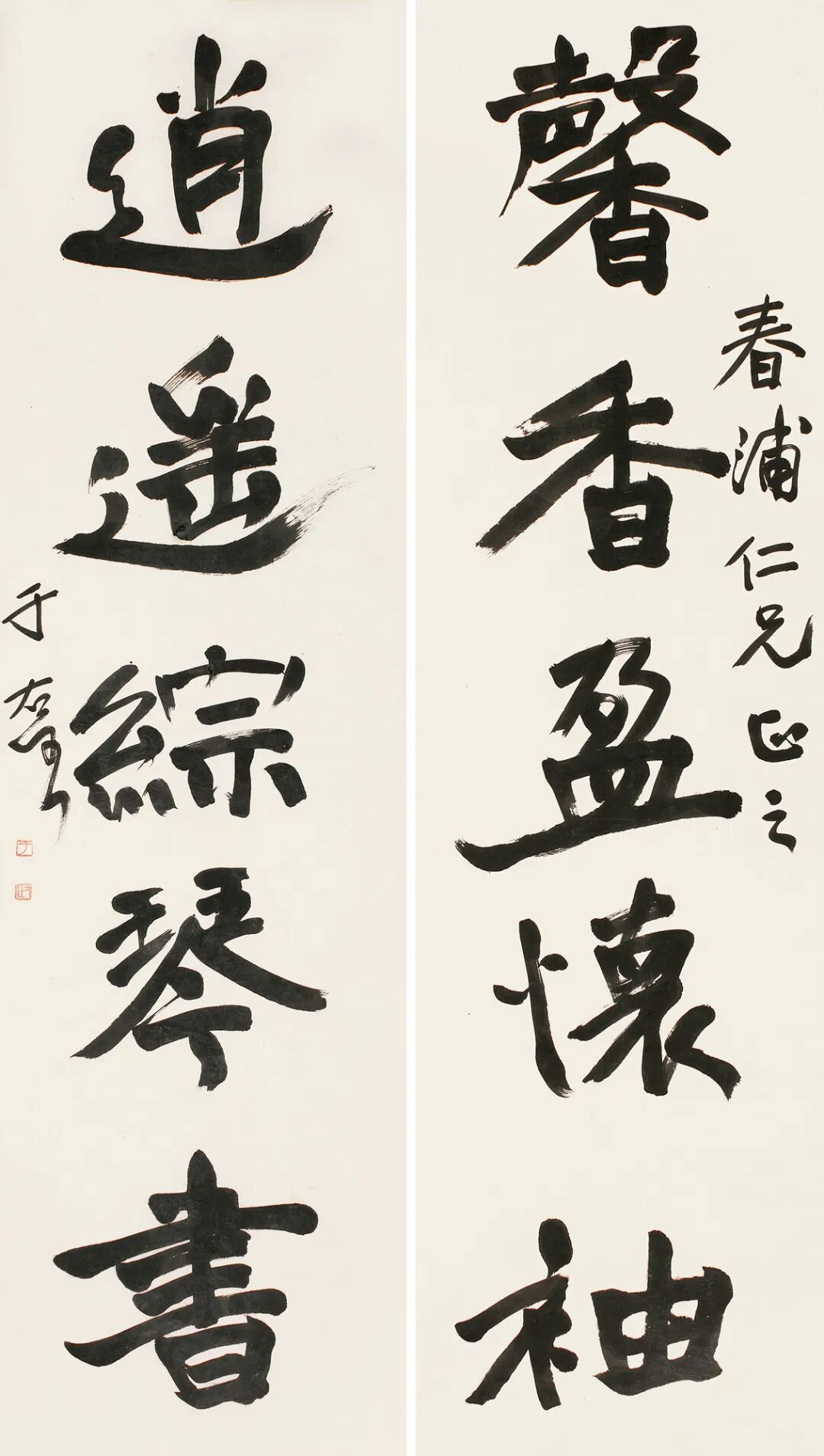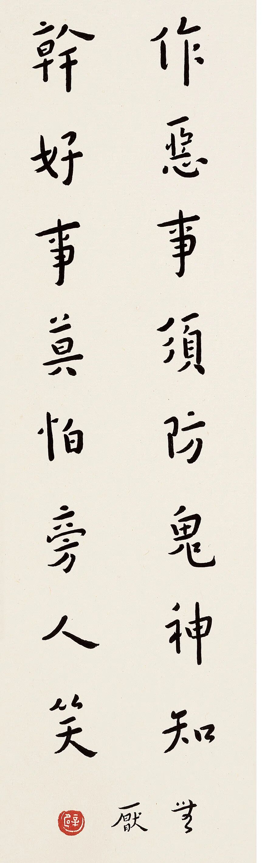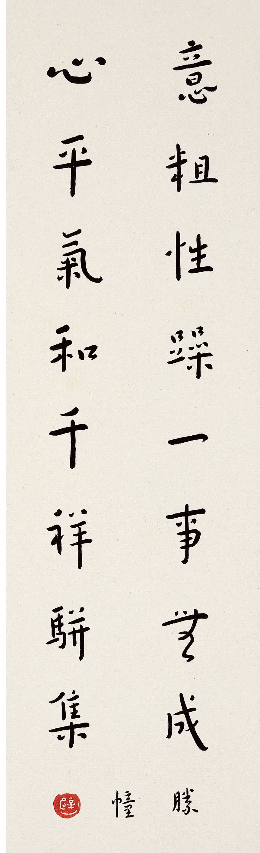 此幅对联为弘一法师中期书法的典型风貌,浩然正气一览无遗。“平划宽结,斜划紧结”,弘一书法早年取法《张猛龙碑》,笔意雄厚,气势开张,用墨滋润,结构精绝、奇正相生,一派北魏风骨。