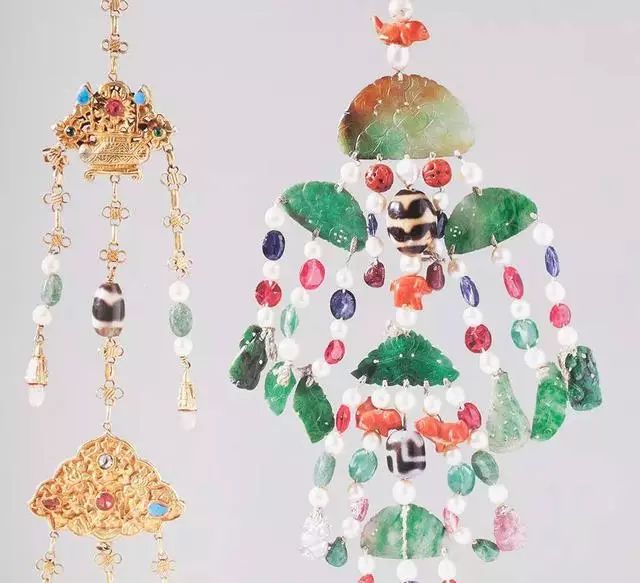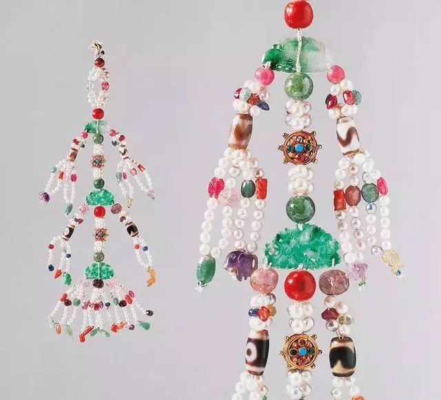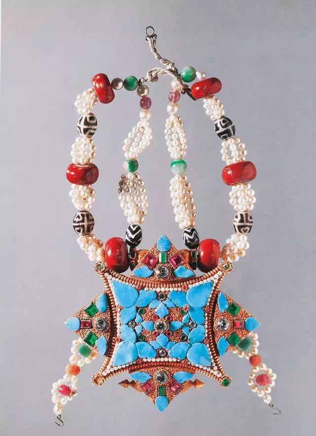 上图为馆藏西藏旧时贵族配饰,由珍贵老天珠、老珊瑚、珍珠、黄金、翡翠等组成。