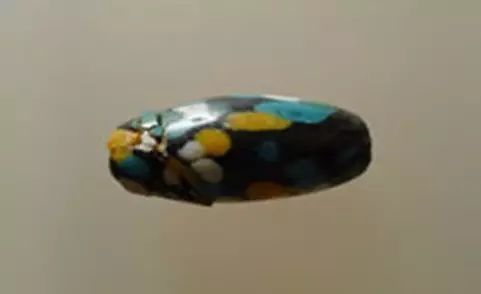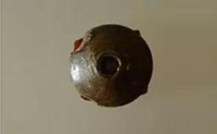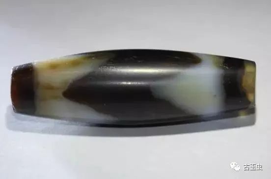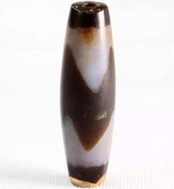 这枚天珠呈橄榄形,两端截平,有穿孔,长2.85厘米,直径0.5厘米,最大径0.9厘米,孔径0.2厘米,深褐色和乳白色相间纹饰,天珠孔内残留有细绳,很明显用于系带。根据发掘所获得的碳14分析,曲踏墓地距今1800年左右。也就是说,这枚天珠的制作年代下限是东汉晚期。