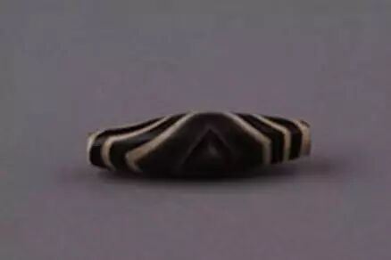 因为,在陕西省咸阳博物馆还躺着一串“玉水晶玛瑙琥珀琉璃串饰”。在这串串饰当中,有一颗带有白色条纹的柱形珠,人们惊讶地发现,这就是一颗天珠。