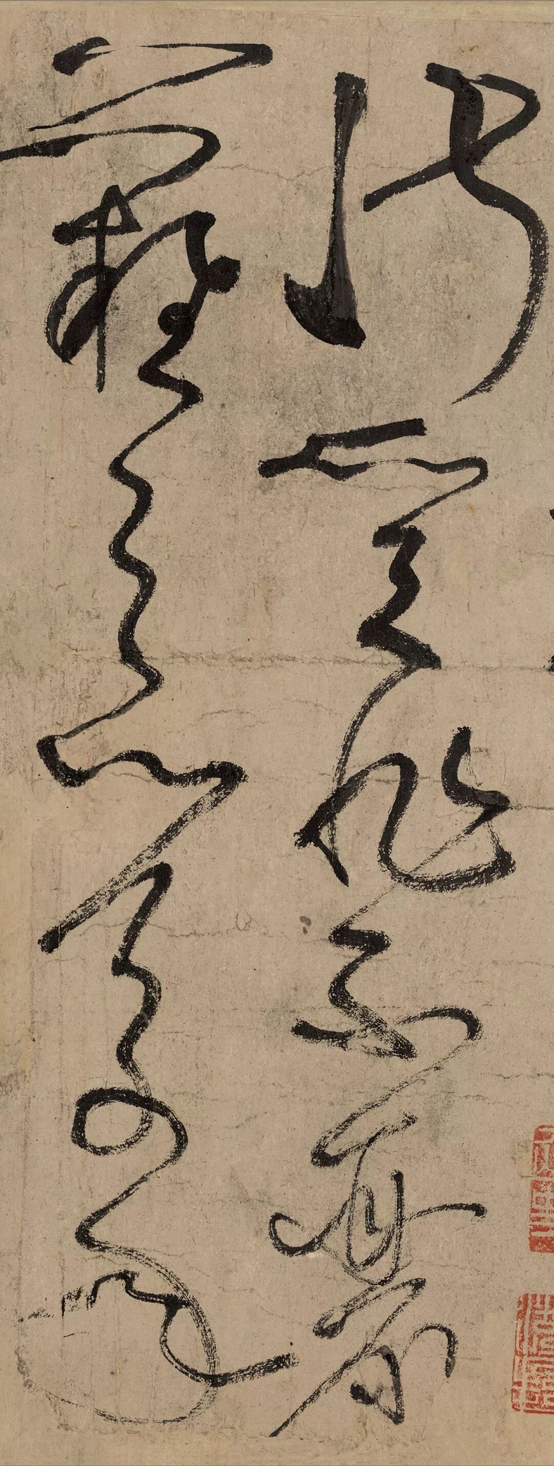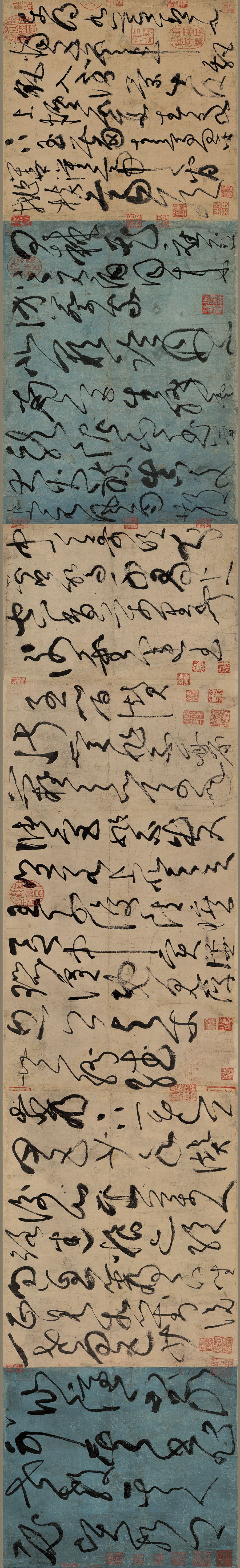 《古诗四帖》既表现了闪电形的折线,又展现了垂直而下的直线,甚至还有迥环缭绕的曲线,相互穿错交织,使人目眩神醉;笔画急切、重复而执着,是中国书法中的精品之作。