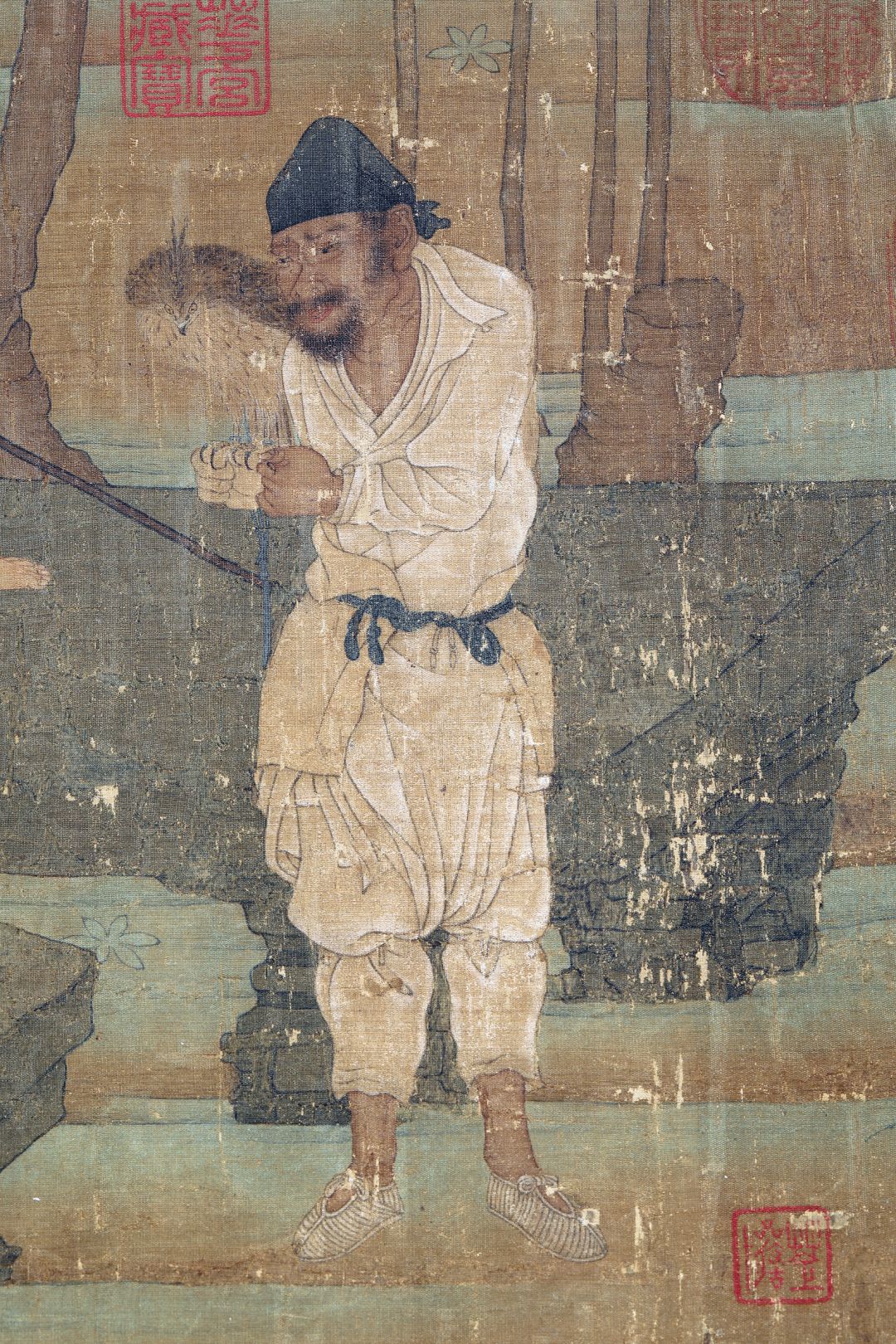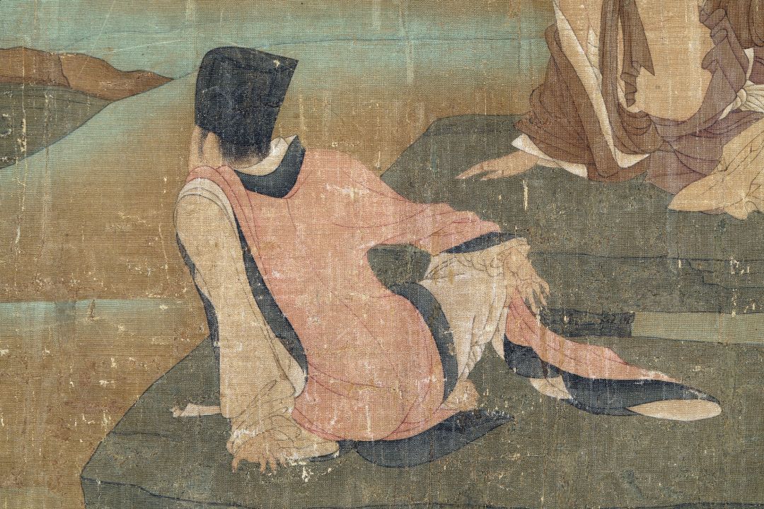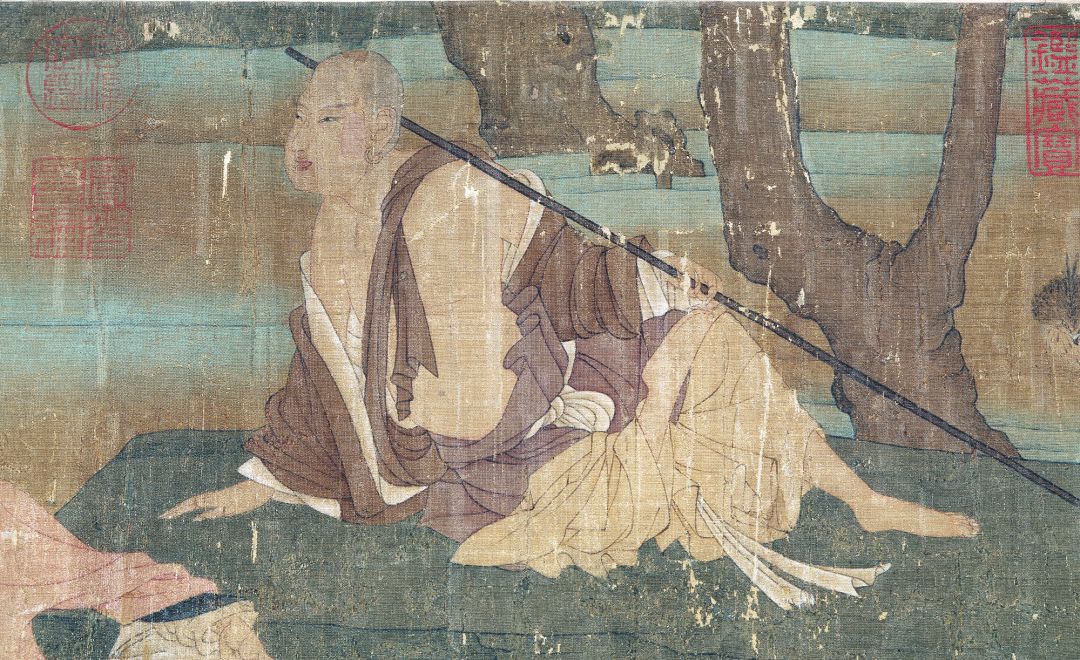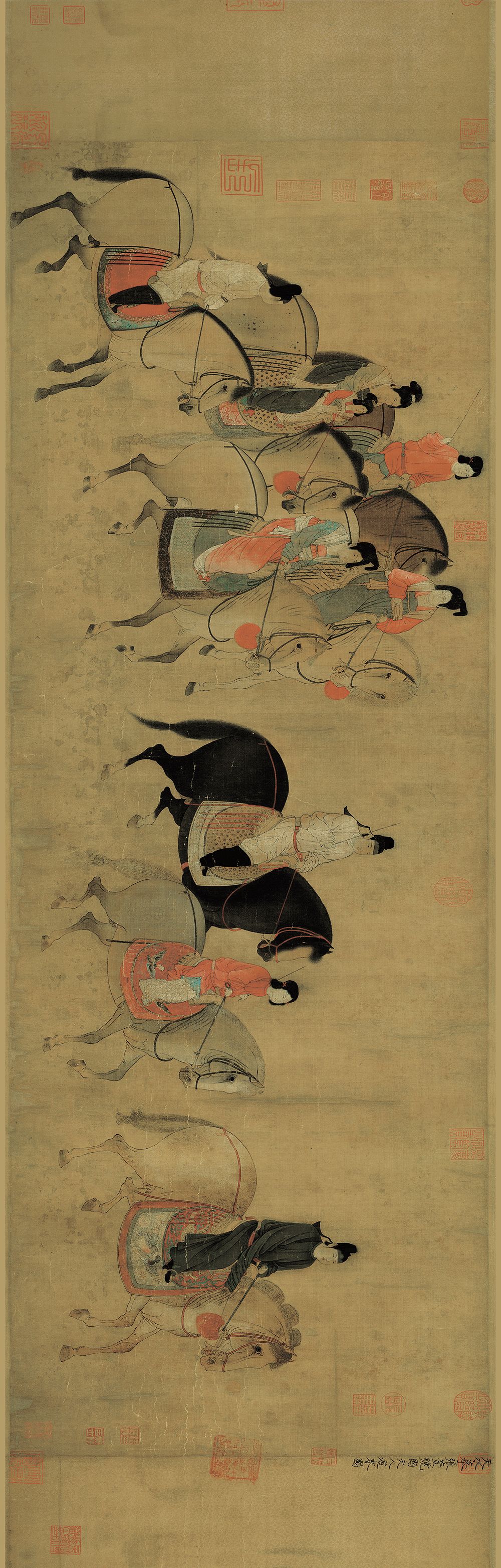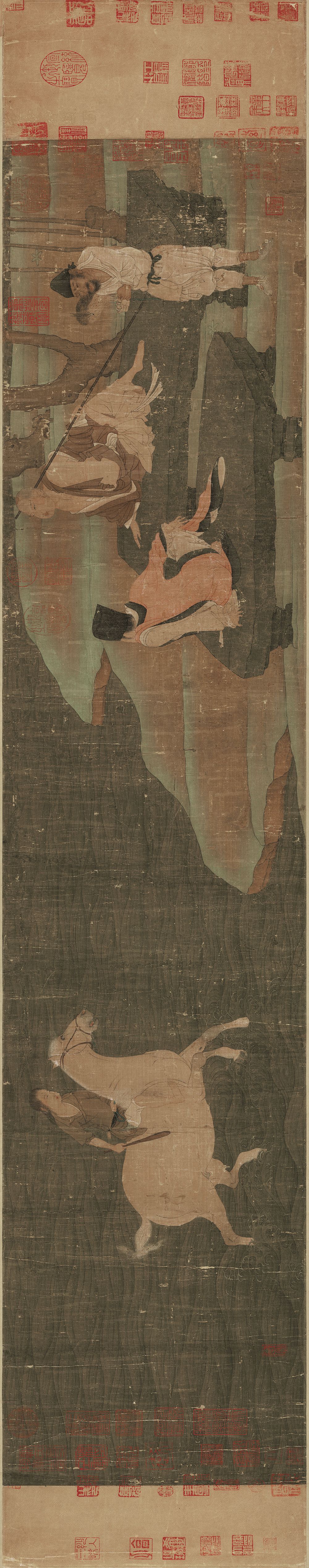 《神骏图》也是一副临摹作品,但技术及其高超。我们可以看到人与马身上的线条极为精练,据说,此画是沿袭了唐人的技法,又秉承了五代的纤巧的风格。