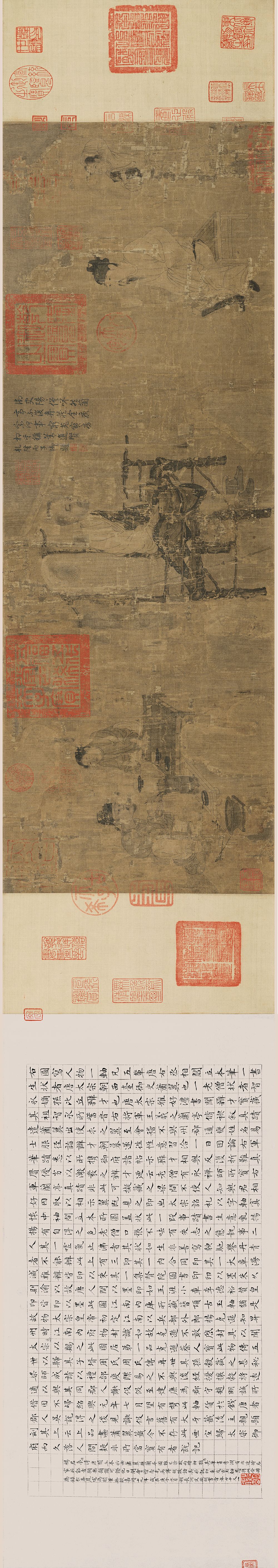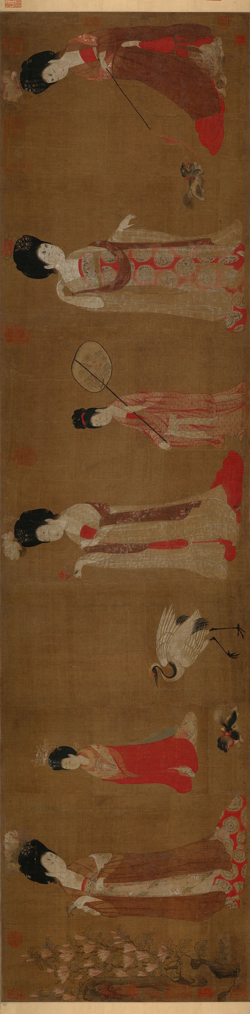 但张萱原作早已消失,此卷被认为北宋画院摹本,但仍具盛唐特色,将张萱笔下仕女们的丰腴、靓丽、表情等再次精美地展现出来。