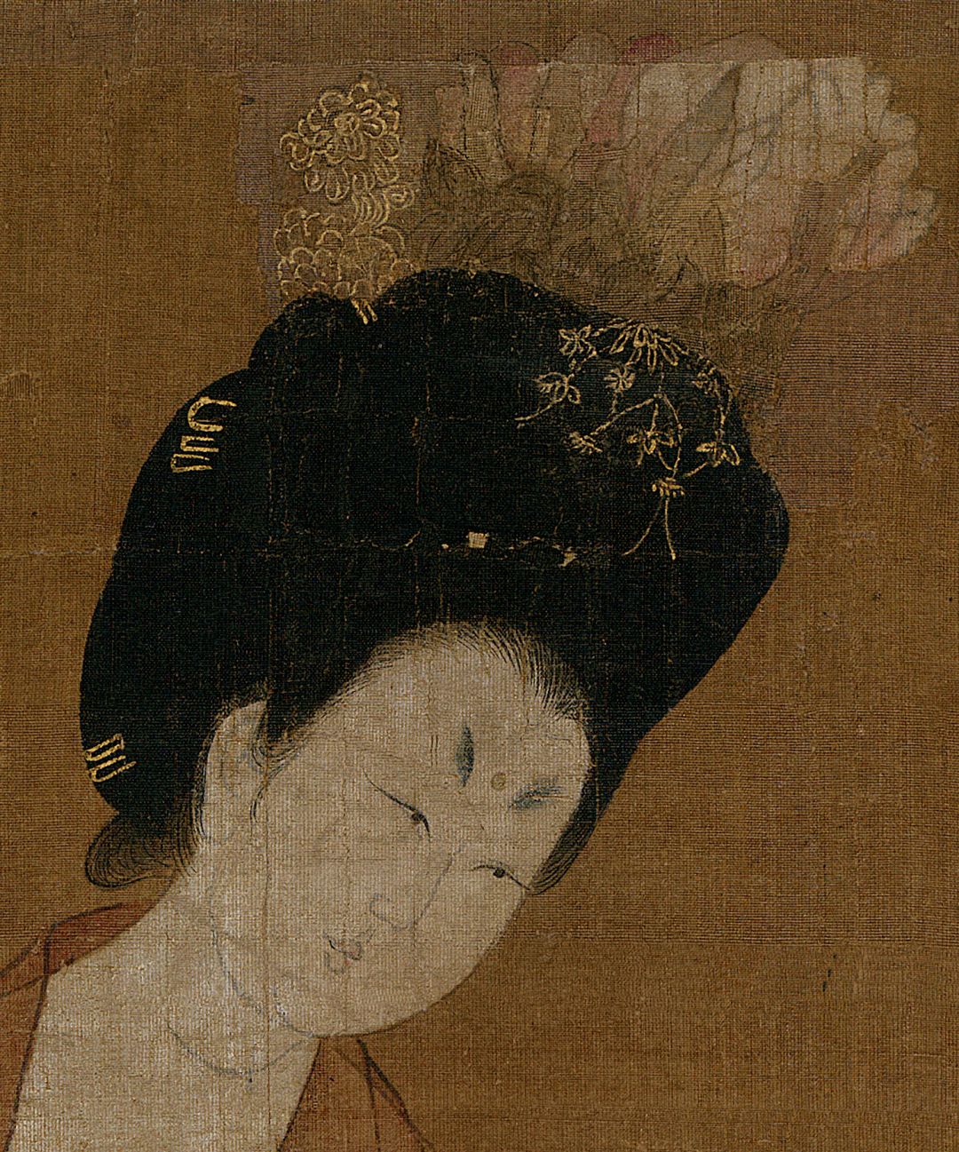 身着绫罗绸缎,头插花朵装饰,蛾眉高挑,朱砂轻点眉心,富贵之气跃然而上。