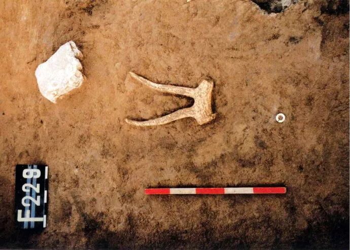 229号房址北部。居住面出土玉玦、鹿角及陶罐。