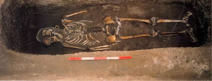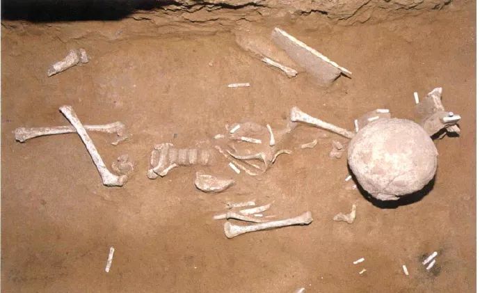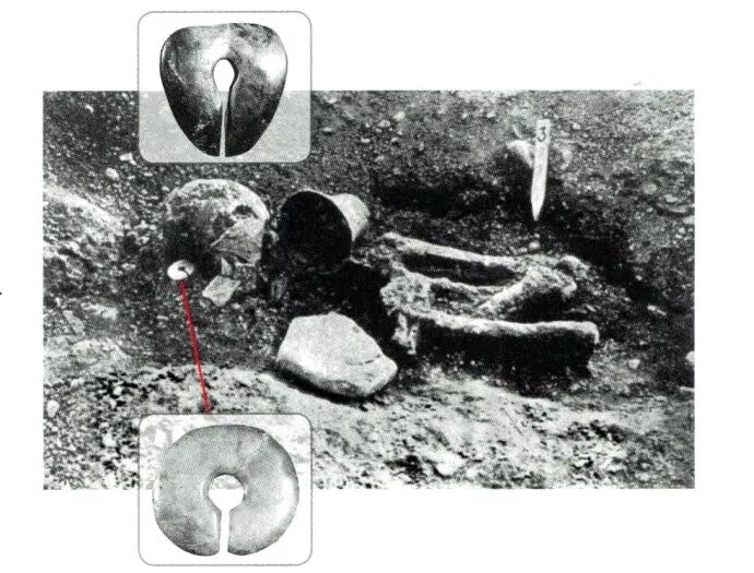 兴隆洼遗址七号墓。M7主人为约25岁男性,左肩和右肱骨各出土一件玉玦,胸部及右腕出土以人头盖骨制成的牌饰。