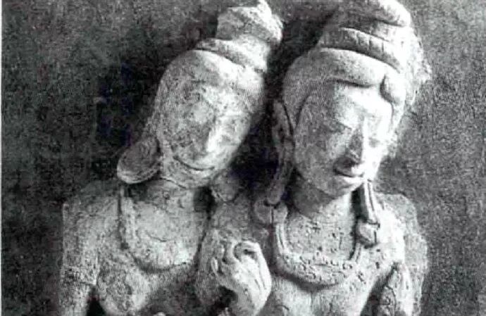 泰国曼谷国家博物馆内展示赤陶双人妇女像。前方妇女穿戴一对玦饰,耳拉长及两肩,是现今所知年代较早玦饰穿戴最写实的例子。