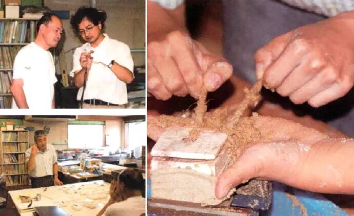 中国和日本考学者模拟上古工艺对玉石进行沙绳切割的实验。