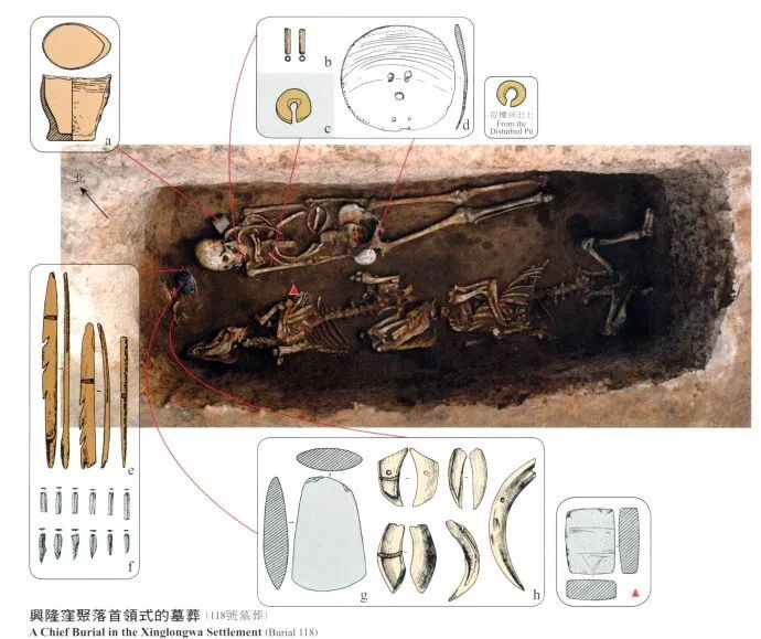 兴隆洼聚落首领式墓葬(118号墓葬)。118号墓是所有居室墓中规格最高的一座。墓主人是五十多岁首领式的男性猎人,随葬品丰富,主要包括:主人生前爱用的狩猎工具,一些刃部嵌有骨梗石刃镖,共伴出土715件细石叶,为骨梗石刃镖刃部更新的备用,可供死后长期使用。骨梗石刃镖很可能主要是一种狩猎的工具,显示狩猎经济占一定的重要性。生产工具有木工用石斧、随身穿孔用骨尖状、刃器和饮用的陶杯。此外,还有一对玉玦耳饰及石管项饰。右手背上压著圆蚌饰,似为法器。人骨的右侧,放置一对完整雌雄的猪,具有明显祈求猎物繁盛之意(或者作为种猪带去另一个世界)?