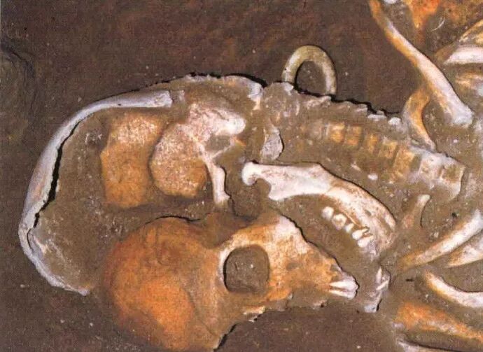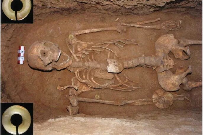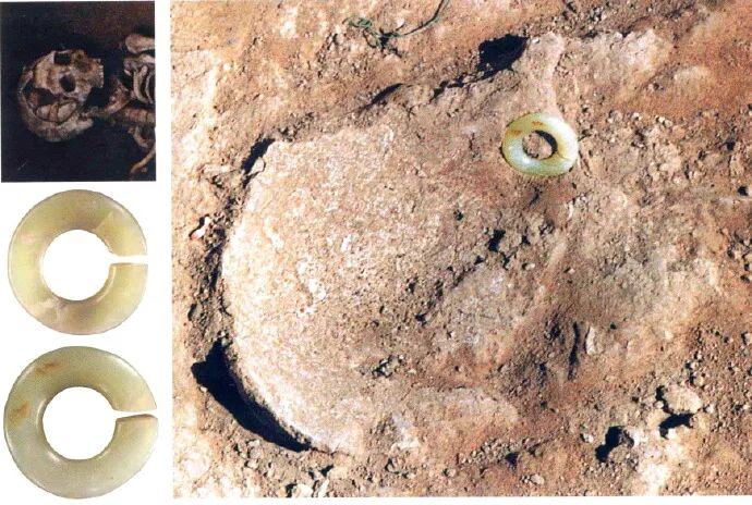 兴隆洼遗址四号墓。M4主人为女童,头骨立置,周围散落很多石管,右眼眶内嵌入一件玉玦,另一玦出自填土。