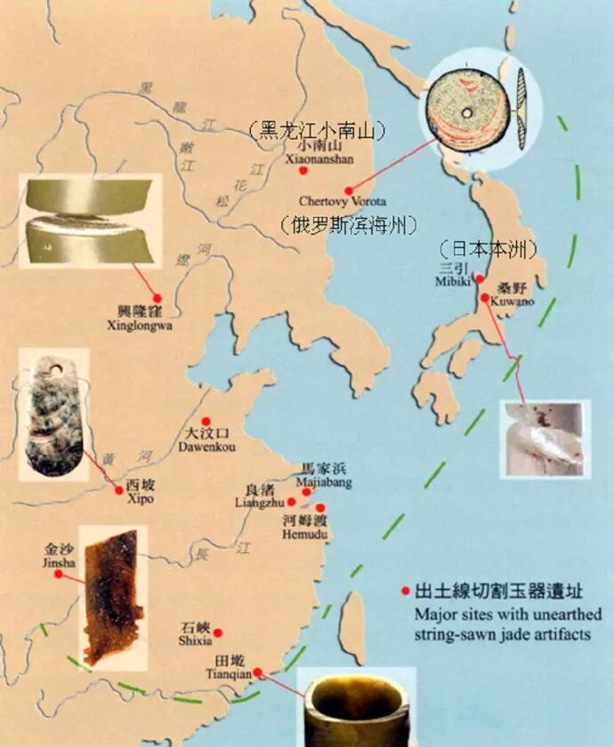 东亚玉石线切割技术分布示意图。史前线切割技术在东北起后,再向四方扩散。目前对玉器线切割技术分布的北限认识不多,至少包括俄罗斯阿穆尔河(黑龙江)流域及滨海洲一带。西面在黄河中游新石器时代晚期(3300bc)及长江上游表铜时代(1000bc)也有些发现。南限方面则较明显,其界限大约在长江以至岭南。东南亚中南半岛以至菲律宾和台湾都并不在线切割技术范围之内。